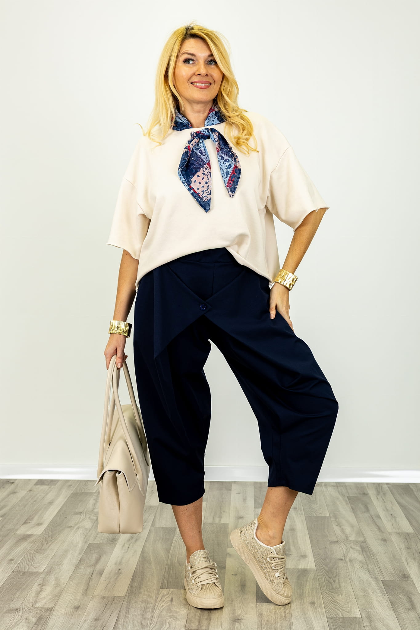 Spodnie z ozdobną kopertową zakładką na przodzie Pratella granatowe