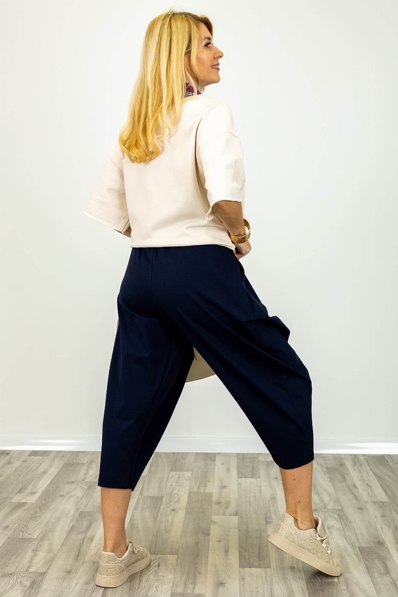 Spodnie Pratella zostały stworzone z myślą o codziennym komforcie i funkcjonalności, łącząc praktyczne rozwiązania z unikalnym krojem. Charakterystycznym elementem modelu jest kopertowa zakładka na przodzie, która nadaje spodniom oryginalnego i nowoczesnego wyglądu. Asymetryczne ułożenie materiału przyciąga wzrok i stanowi ciekawy element dekoracyjny, jednocześnie zachowując elegancki, minimalistyczny styl. W pasie znajduje się elastyczna gumka, dzięki której spodnie idealnie dopasowują się do sylwetki, zapewniając wygodę przez cały dzień. Boczne kieszenie zostały subtelnie wkomponowane w całość, pełniąc praktyczną rolę bez nadmiernego akcentowania wizualnego.