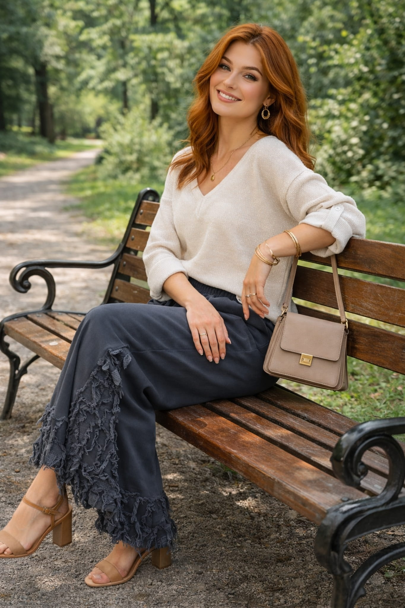 Najbardziej charakterystycznym elementem jest doszywany pas z dekoracyjnie postrzępionej tkaniny przy dole nogawek. Ten detal przyciąga uwagę i nadaje spodniom indywidualnego charakteru, wyróżniając je na tle klasycznych fasonów. Strukturalne wykończenie przełamuje prostą linię nogawki i dodaje całości głębi oraz nowoczesnego wyrazu.