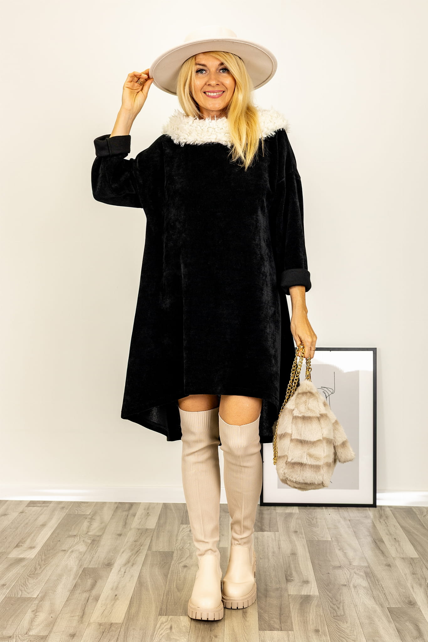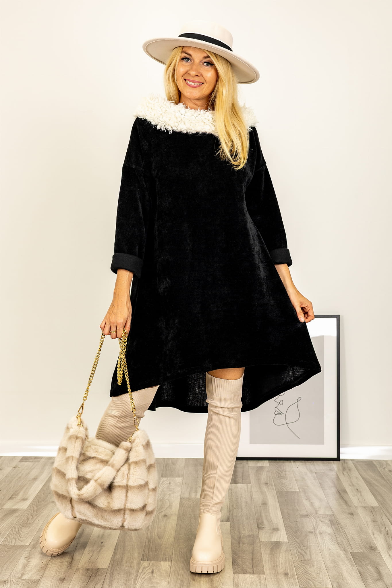 Sukienka asymetryczna oversize ocieplana z kołnierzem barankiem Tolloa czarna