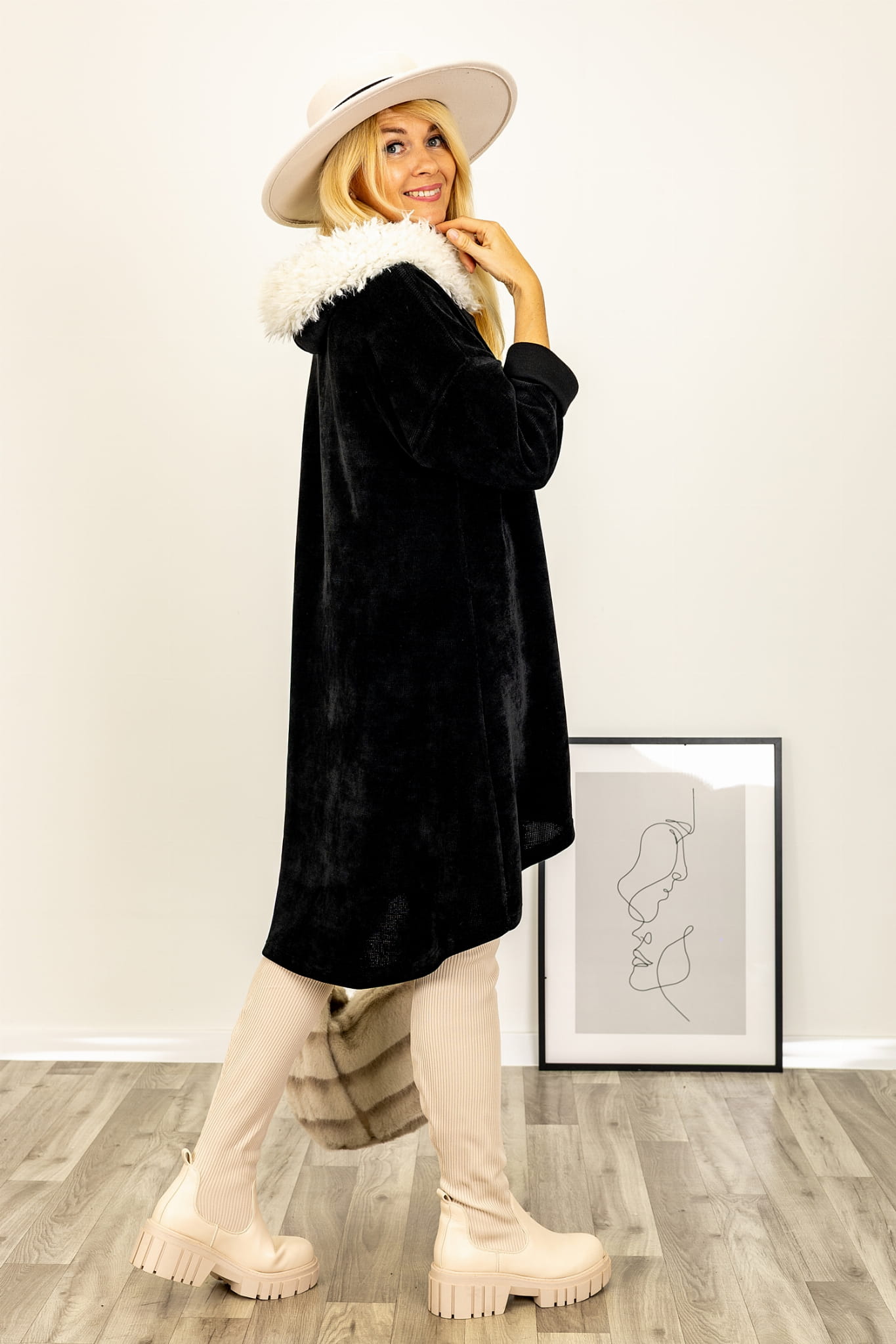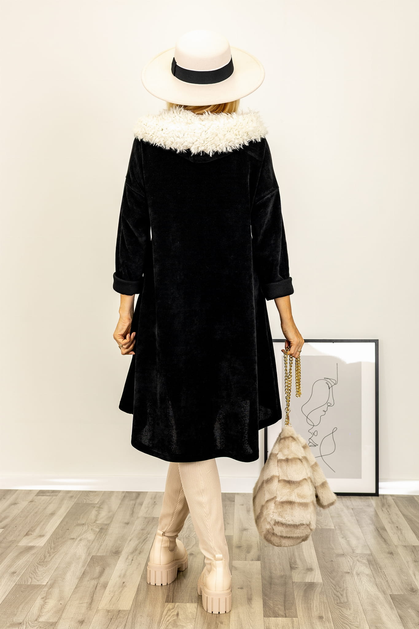 Sukienka Tolloa czarna to wyjątkowa propozycja na chłodniejsze dni, łącząca modny fason z komfortem noszenia. Wykonana została z miękkiej, welurowej tkaniny, która pięknie układa się na sylwetce i dodaje całości eleganckiego wyglądu. Charakterystycznym elementem modelu jest obszerny kołnierz obszyty białym „barankiem”, który pełni zarówno funkcję ozdobną, jak i praktyczną – ociepla i dodaje uroku.