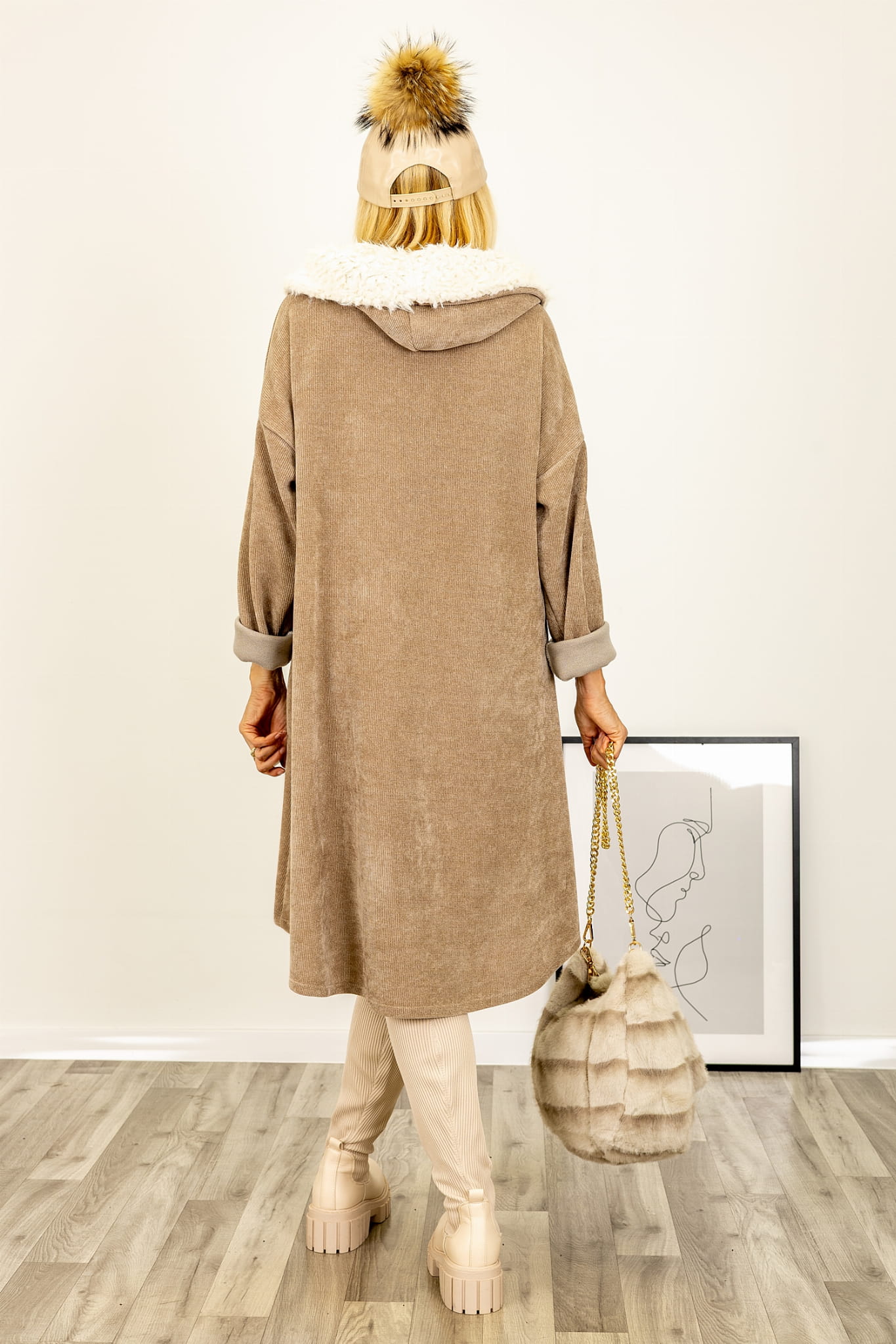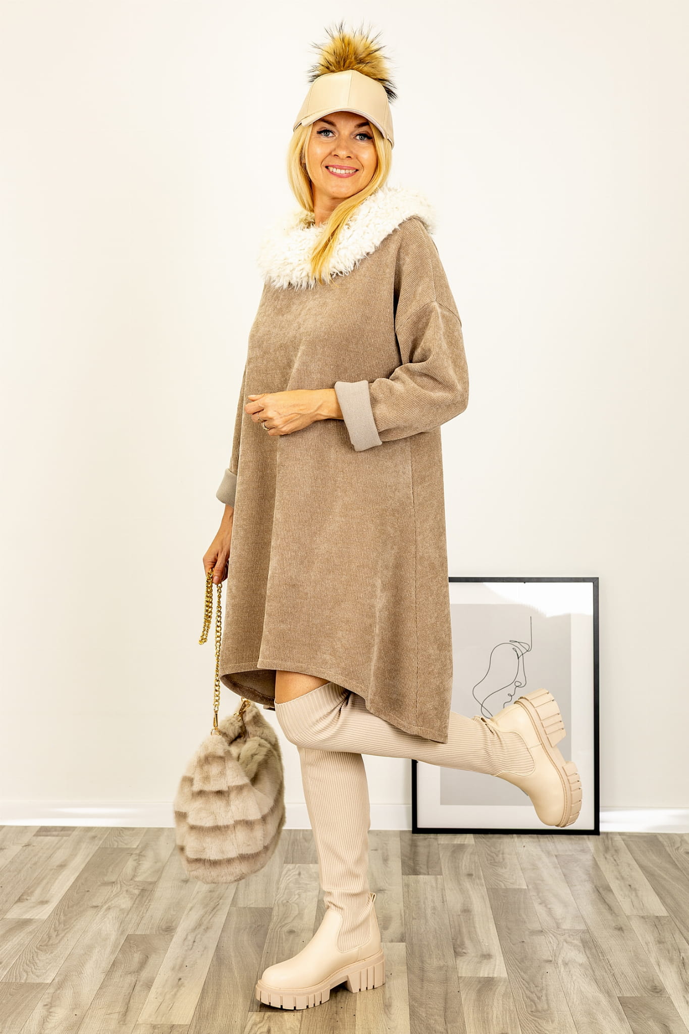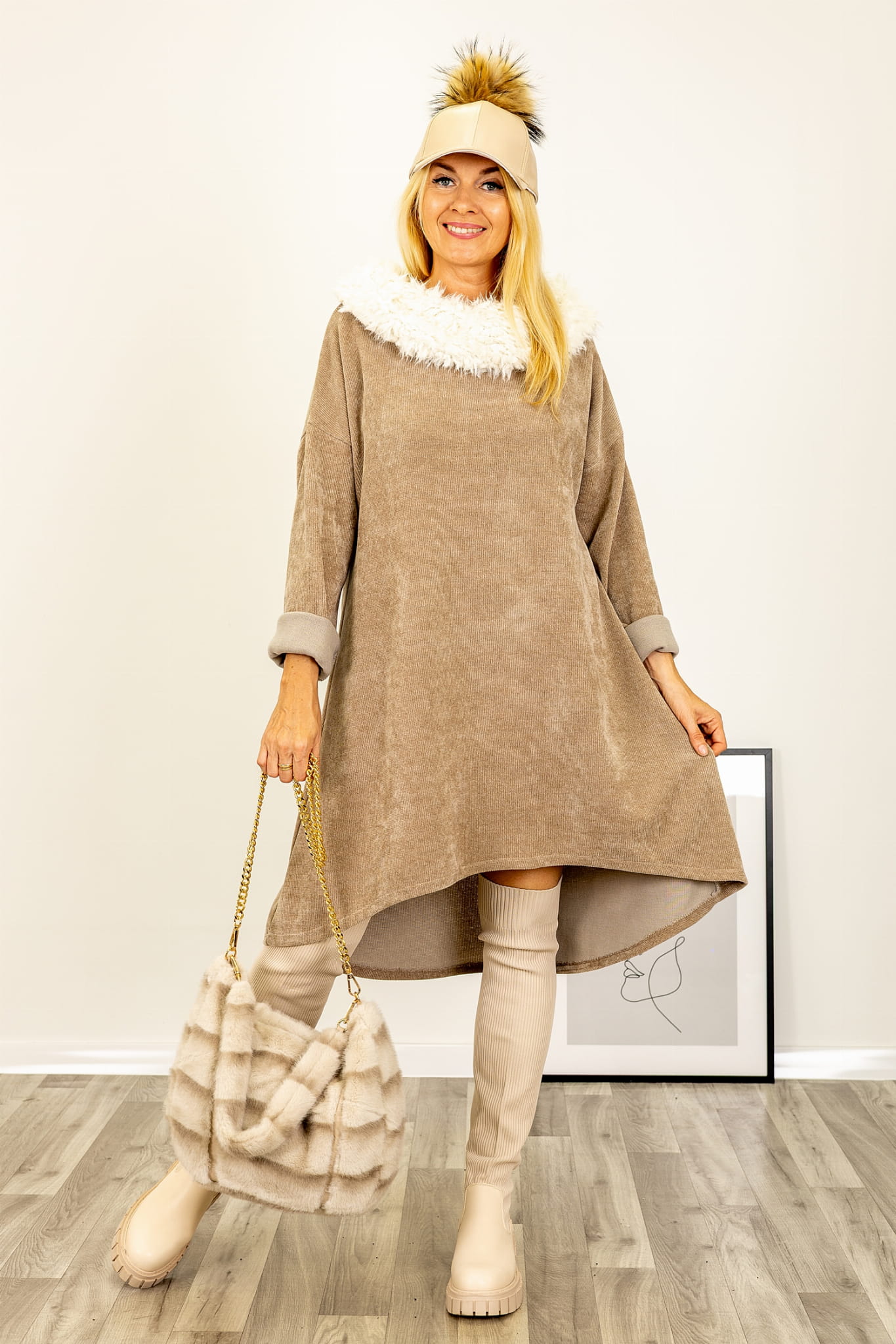 Sukienka Tolloa fango to wyjątkowa propozycja na chłodniejsze dni, łącząca modny fason z komfortem noszenia. Wykonana została z miękkiej, welurowej tkaniny, która pięknie układa się na sylwetce i dodaje całości eleganckiego wyglądu. Charakterystycznym elementem modelu jest obszerny kołnierz obszyty białym „barankiem”, który pełni zarówno funkcję ozdobną, jak i praktyczną – ociepla i dodaje uroku.