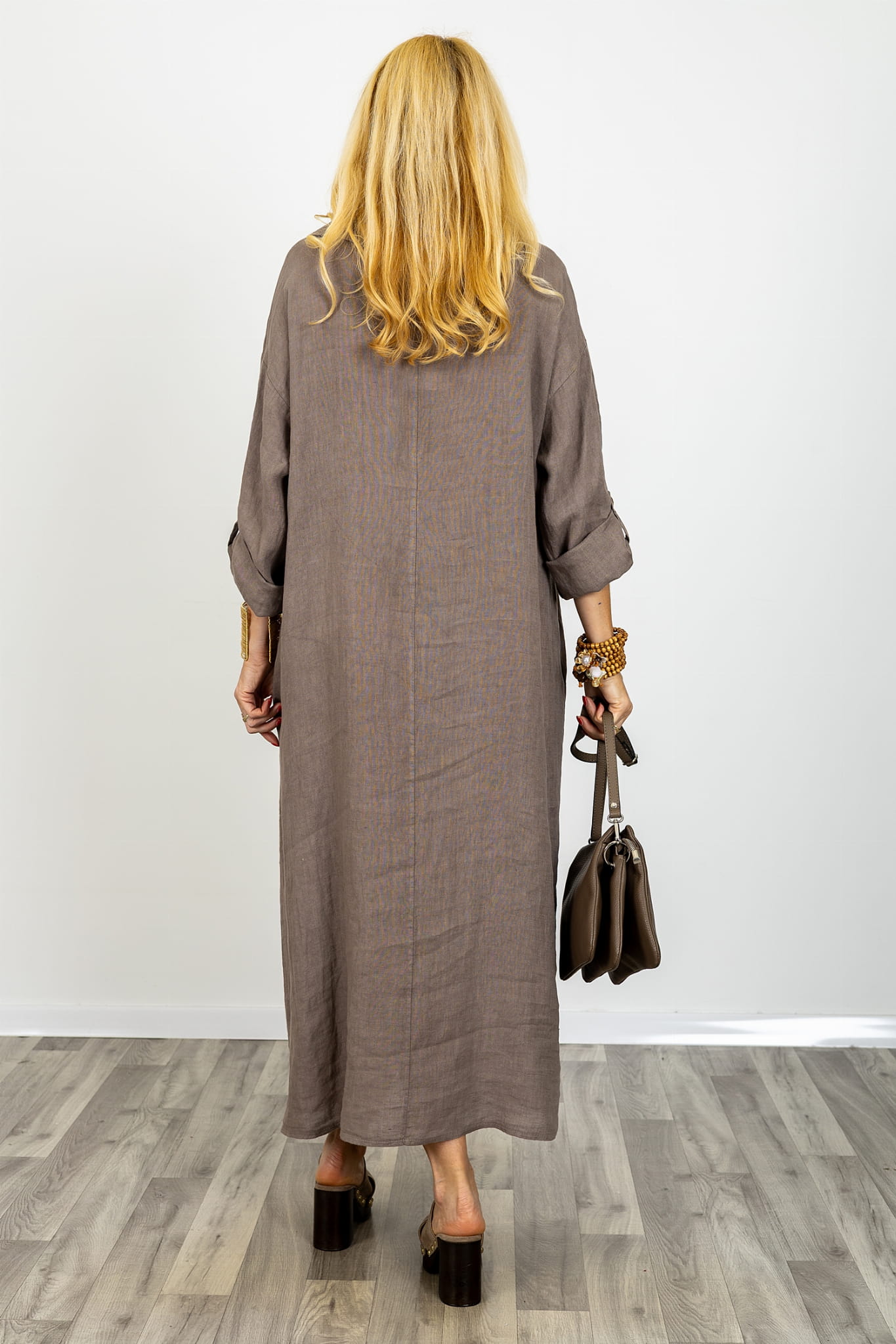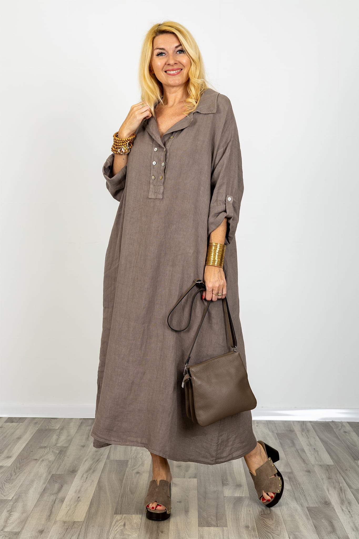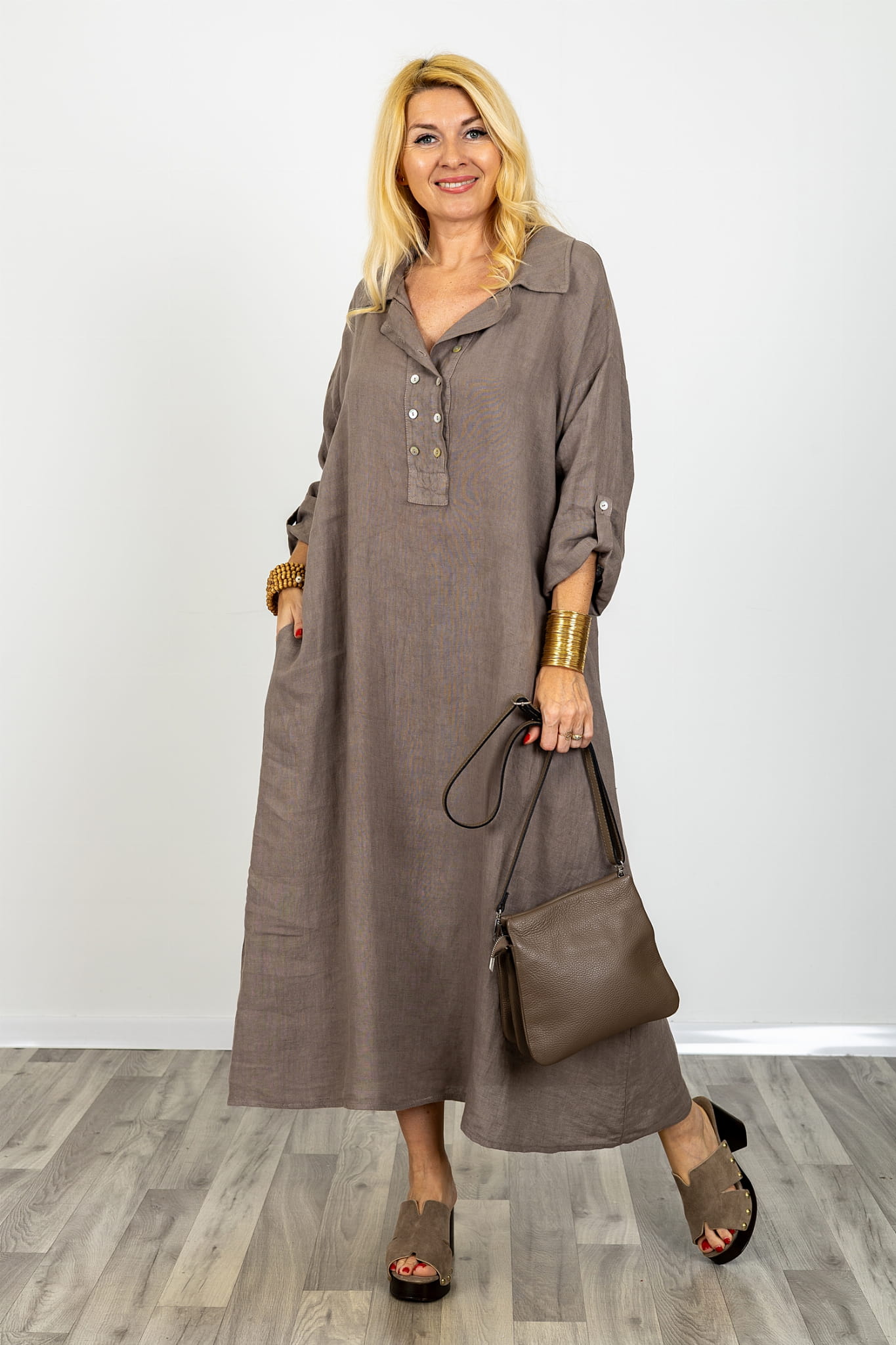 Sukienka lniana maxi oversize plus size z regulowanym dekoltem na guziki kieszeniami kołnierzykiem i podpinanymi rękawami Usseglio fango