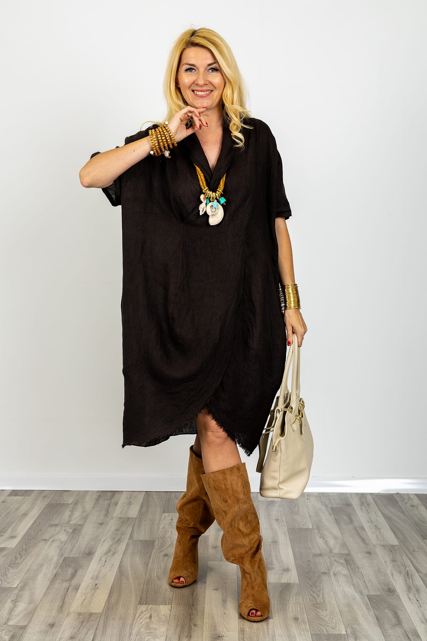 Sukienka lniana midi asymetryczna ze strzępionym dołem z kieszeniami i rękawem kimono dekoltem V kopertowym Oristano brązowa