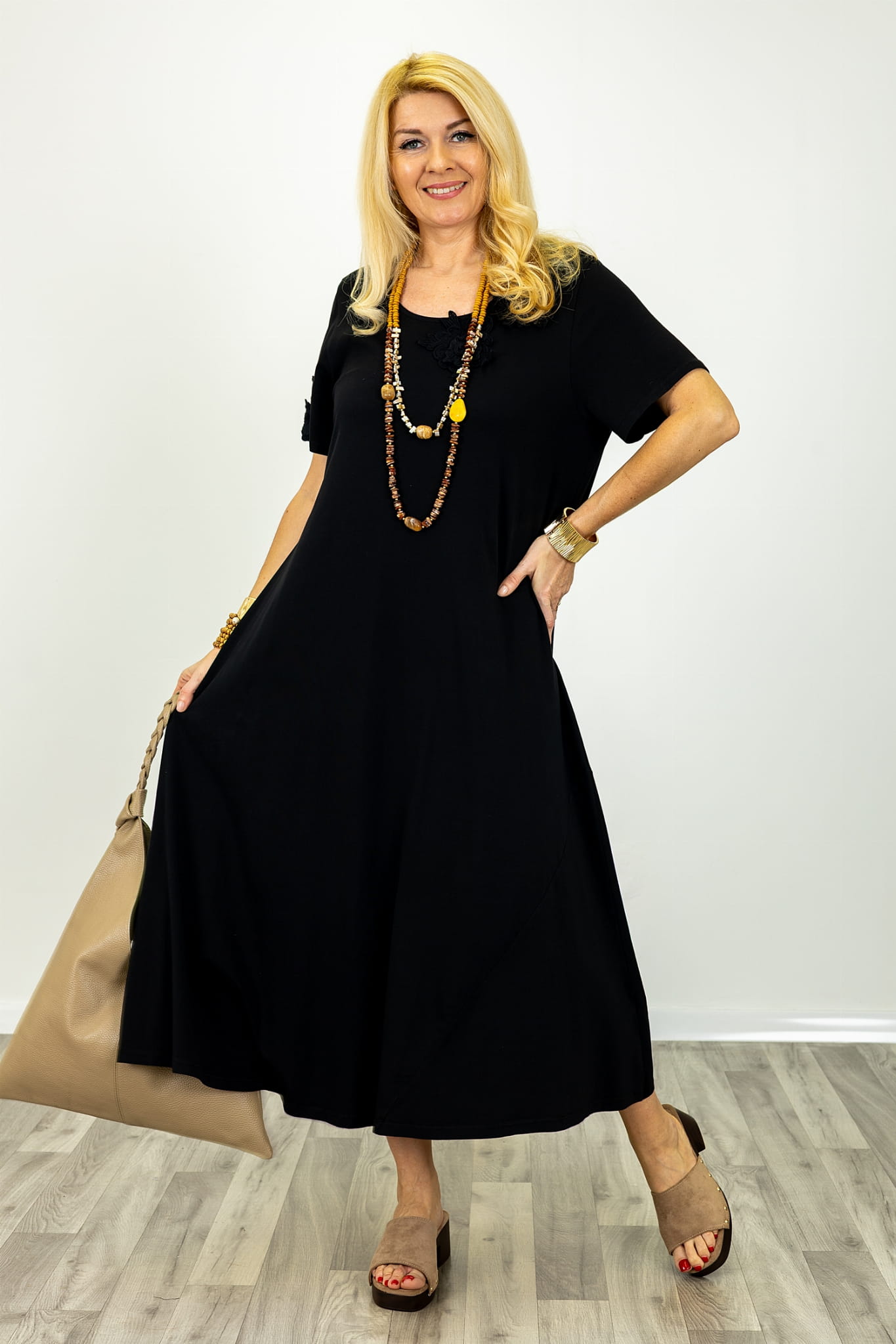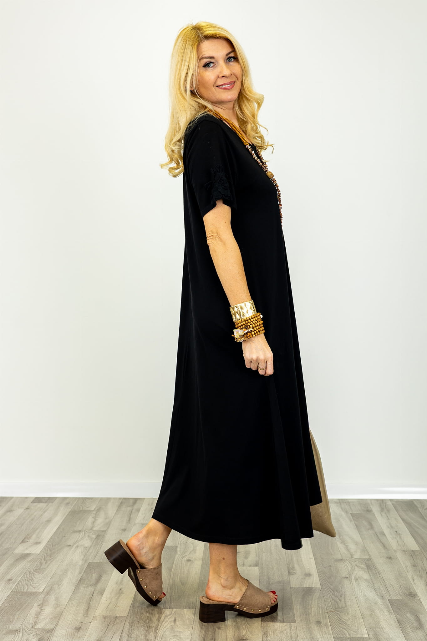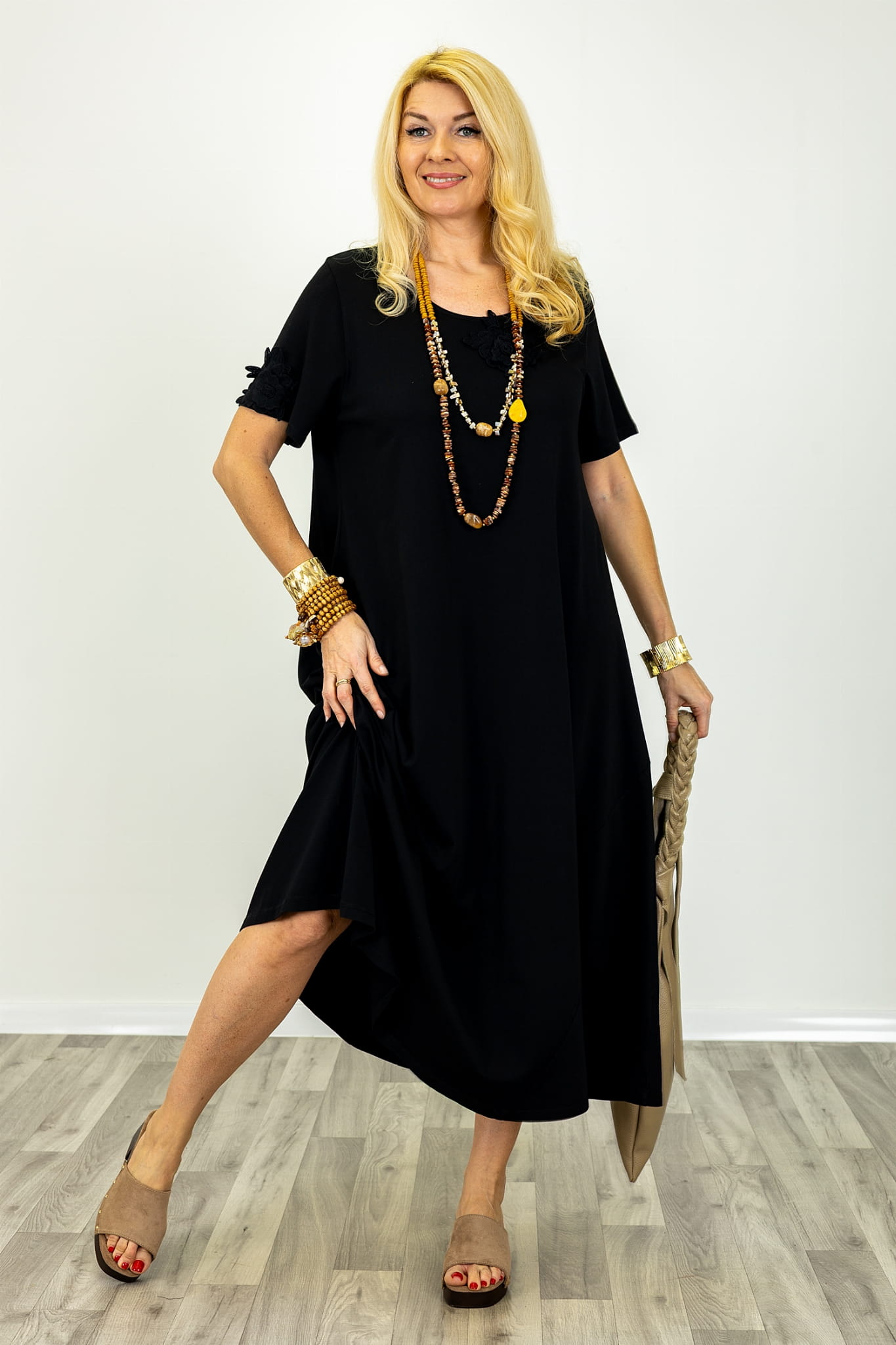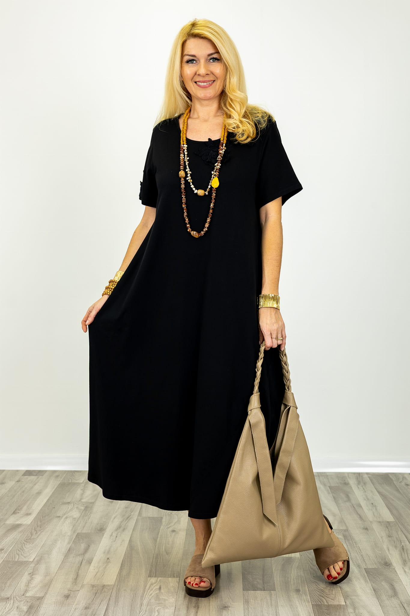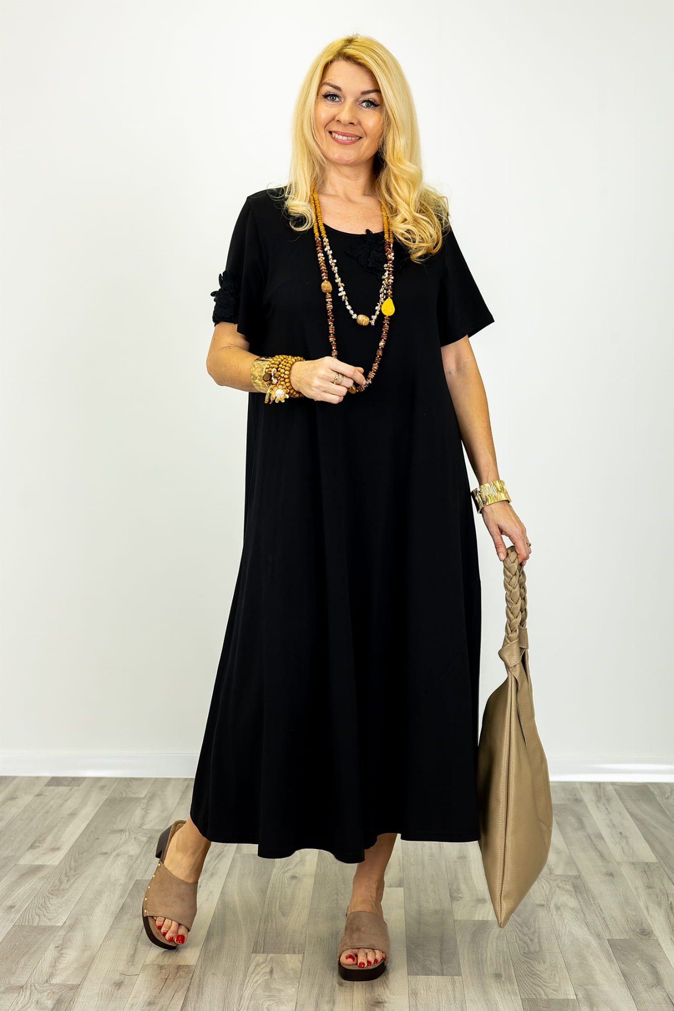 Sukienka maxi krótki rękaw okrągły dekolt kwiatki 3D przy dekolcie i na jednym rękawie Briosco czarna