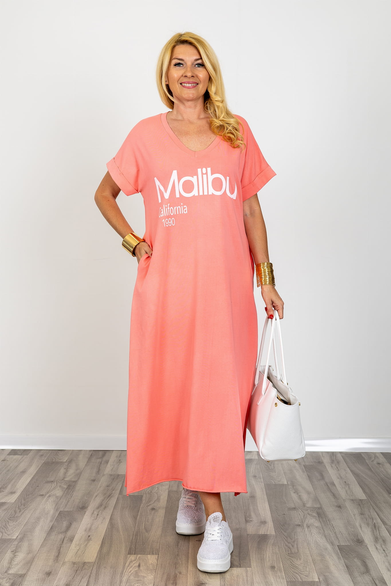 Koralowa sukienka maxi z napisem MALIBU nadaje całości nowoczesnego, miejskiego charakteru i wyróżnia się na tle klasycznych fasonów. Sukienka maxi oversize z nadrukiem to propozycja dla kobiet, które lubią proste kroje z wyrazistym akcentem. Odcień koralowy, określany także jako łososiowy, morelowy lub pomarańczowo różowy, wpisuje się w wiosenno letnią kolorystykę i sprawia, że sukienka maxi na lato prezentuje się świeżo i kobieco.