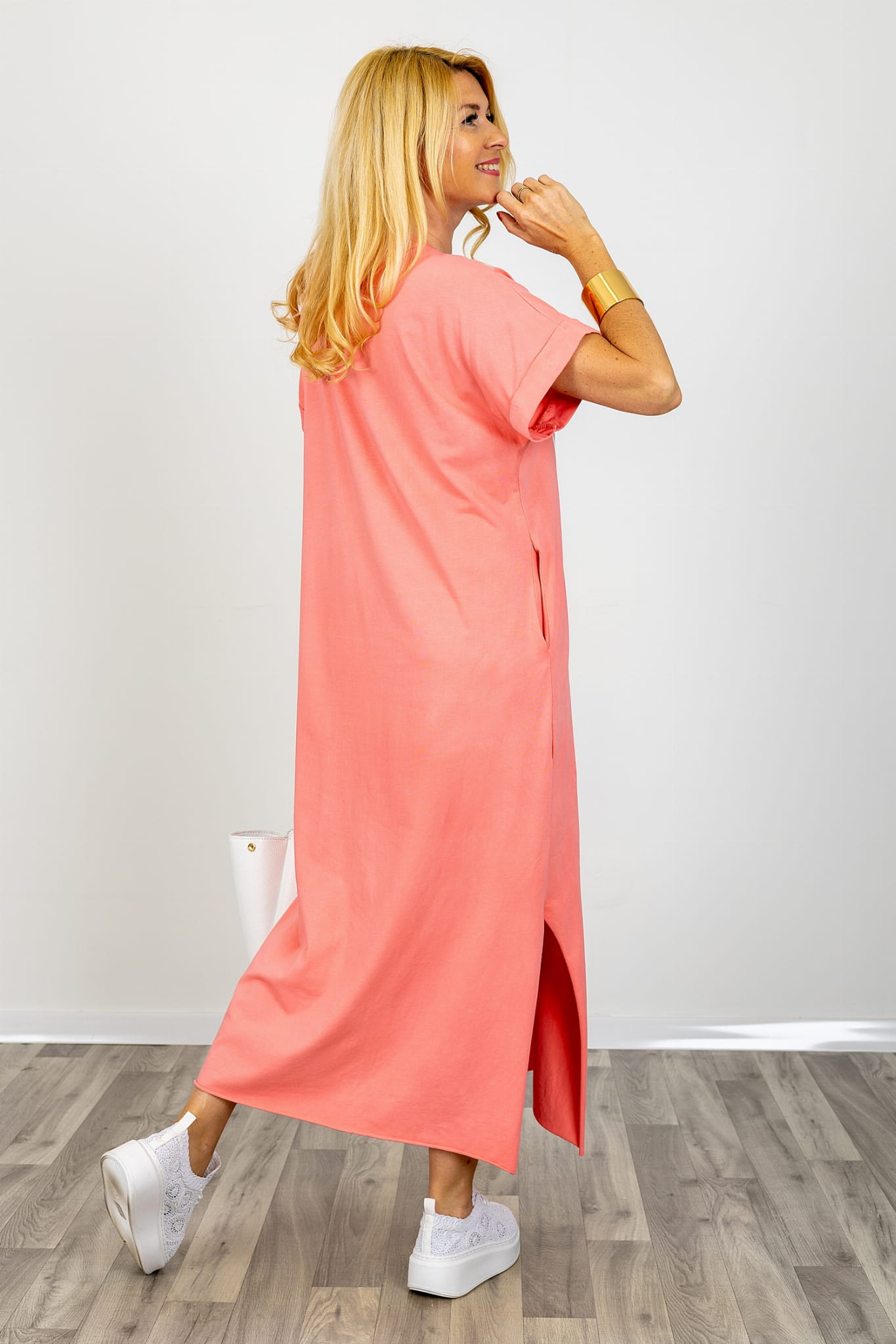 Sukienka maxi casual oversize to uniwersalna baza, która sprawdza się jako sukienka damska codzienna, sukienka oversize na co dzień lub sukienka t shirt damska długa. Luźna sukienka maxi oversize daje komfort przez cały dzień, nie ogranicza ruchów i dobrze układa się na sylwetce. Długa sukienka oversize damska w kolorze koralowym łączy wygodę, modny wygląd i funkcjonalność, dlatego jest doskonałym wyborem na wiosnę i lato.