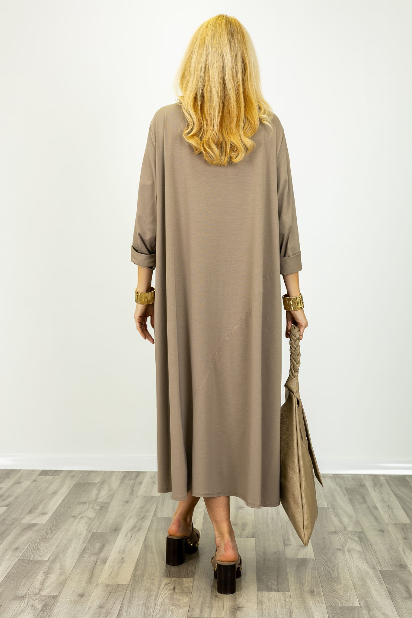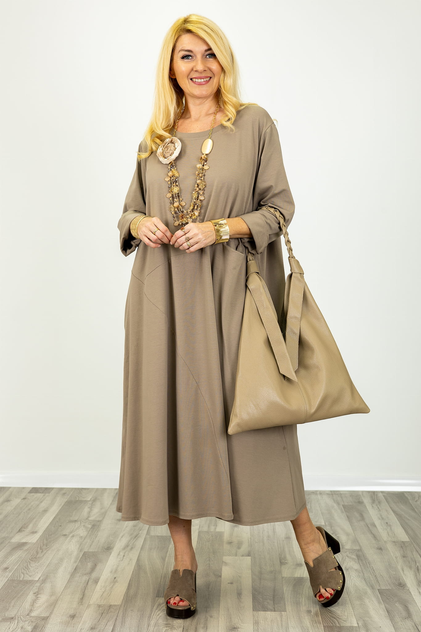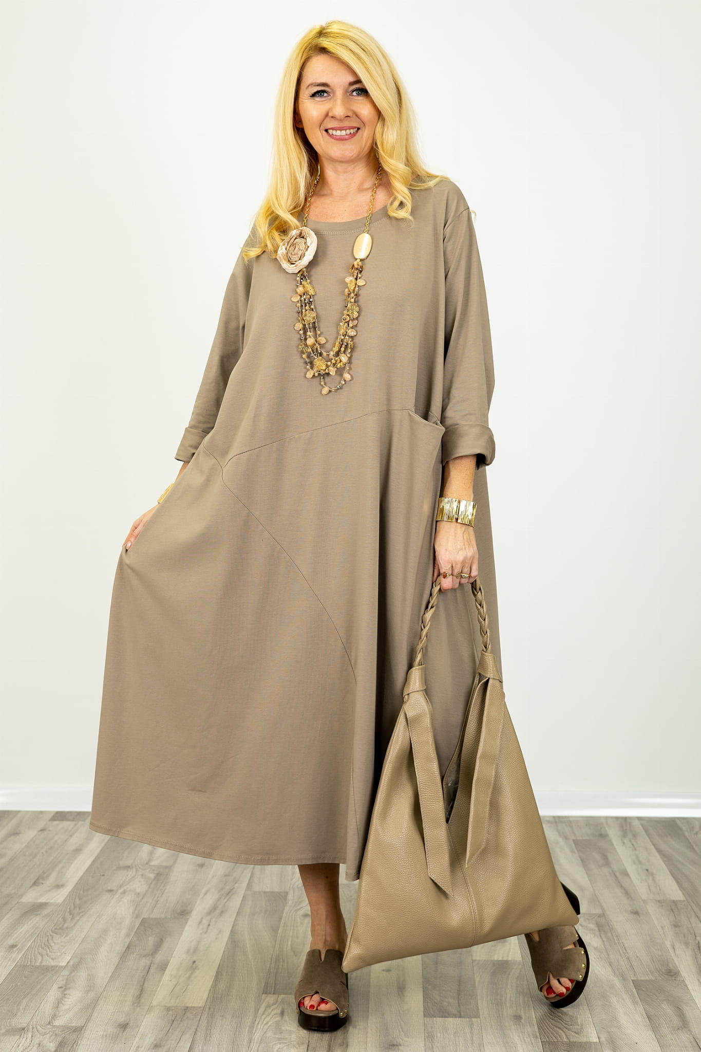 Sukienka maxi oversize z przeszyciami i kieszeniami z okrągłym dekoltem Prignano fango