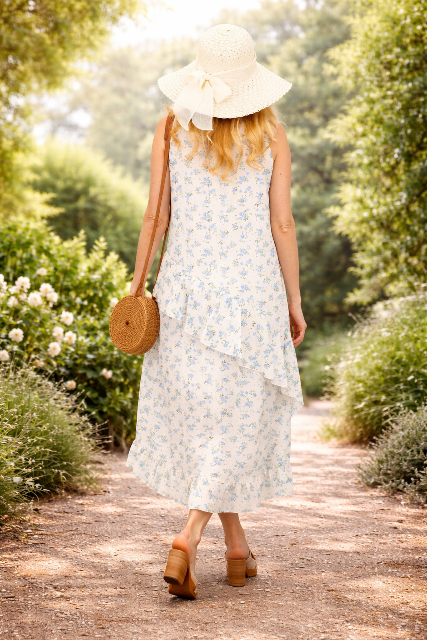 Sukienka midi asymetryczna na grubych ramiączkach z falbankami i podszewką w kwiatowy print Monticchio beżowa z niebieskim