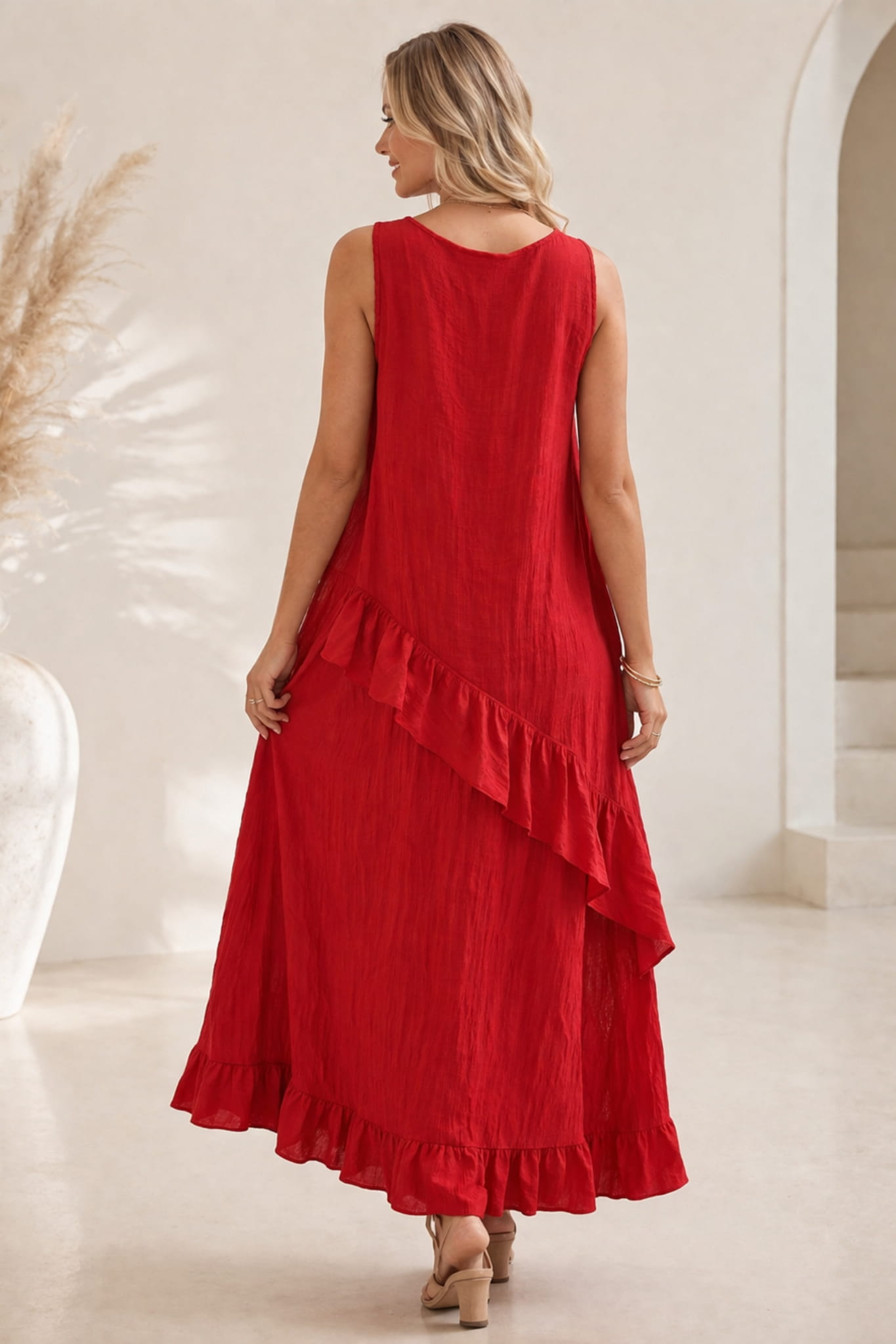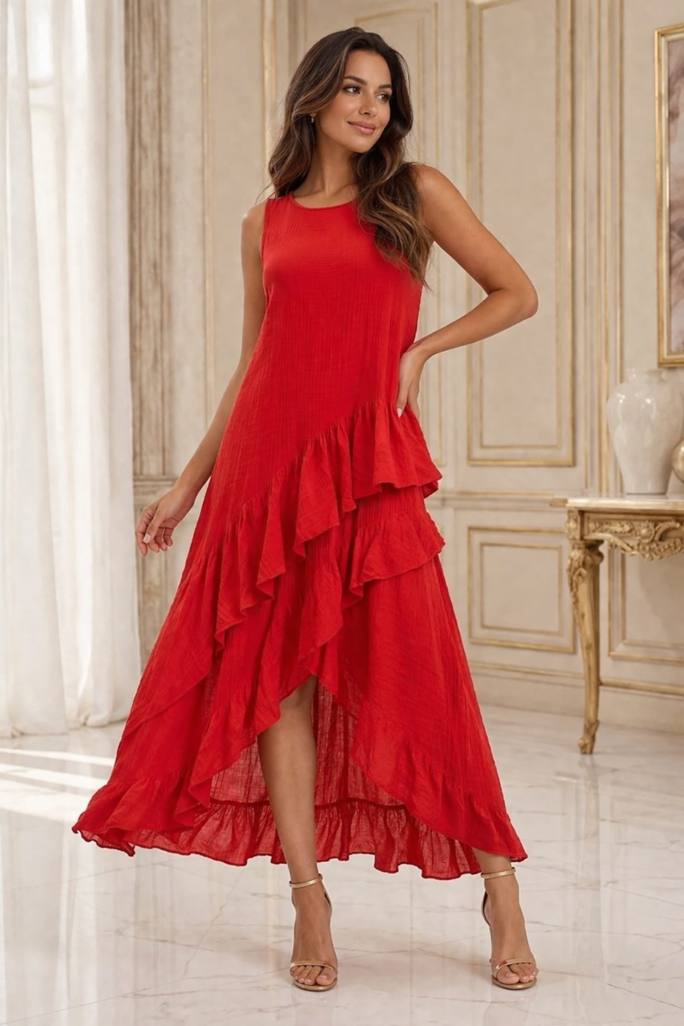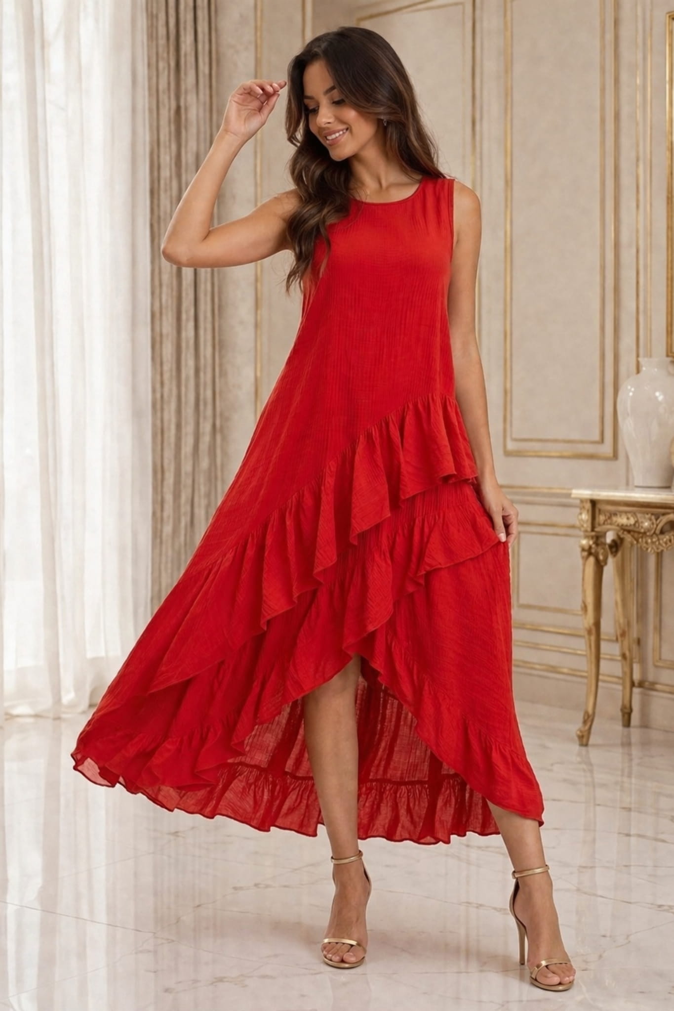 Sukienka midi asymetryczna gnieciona na szerokich ramiączkach z falbankami okrągłym dekoltem Custonaci czerowna