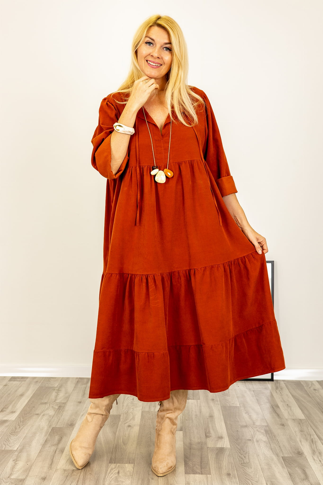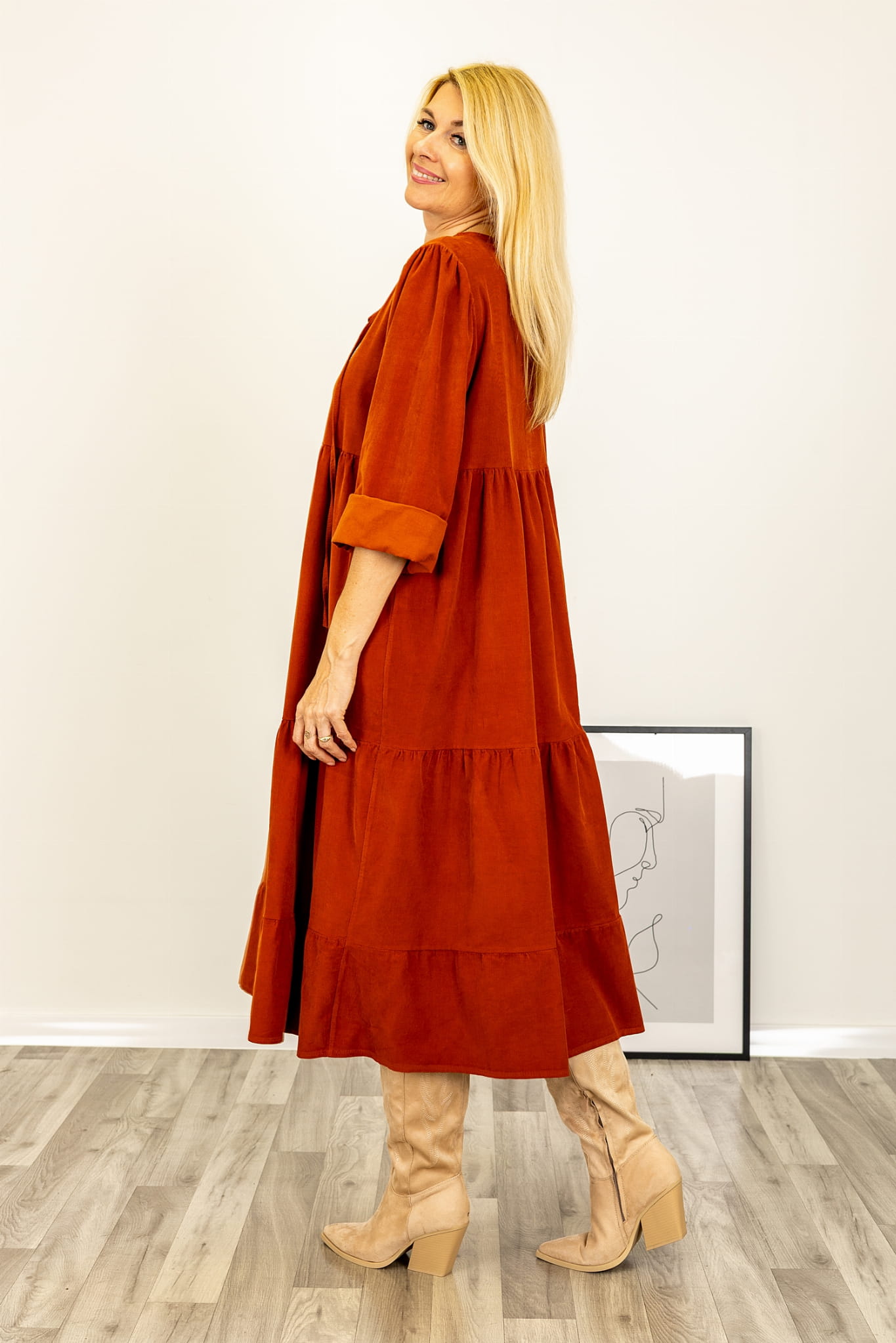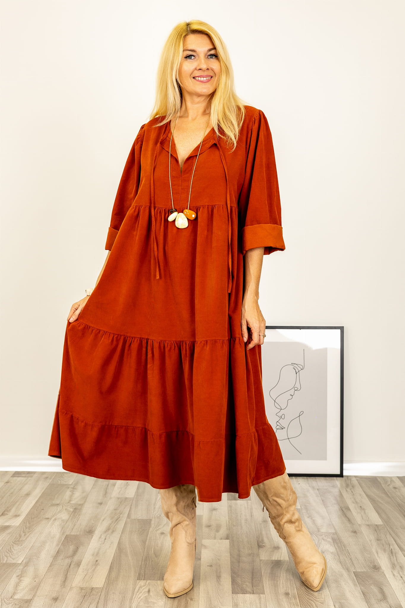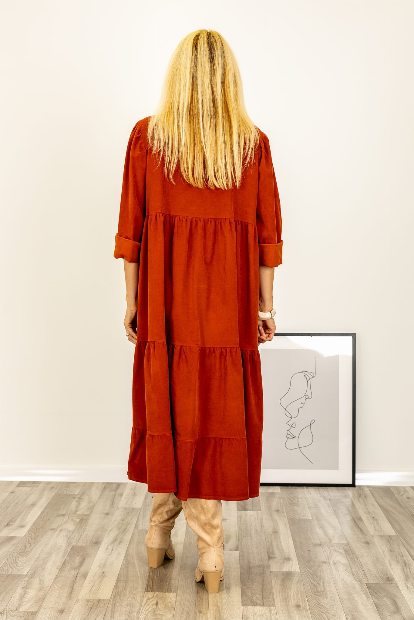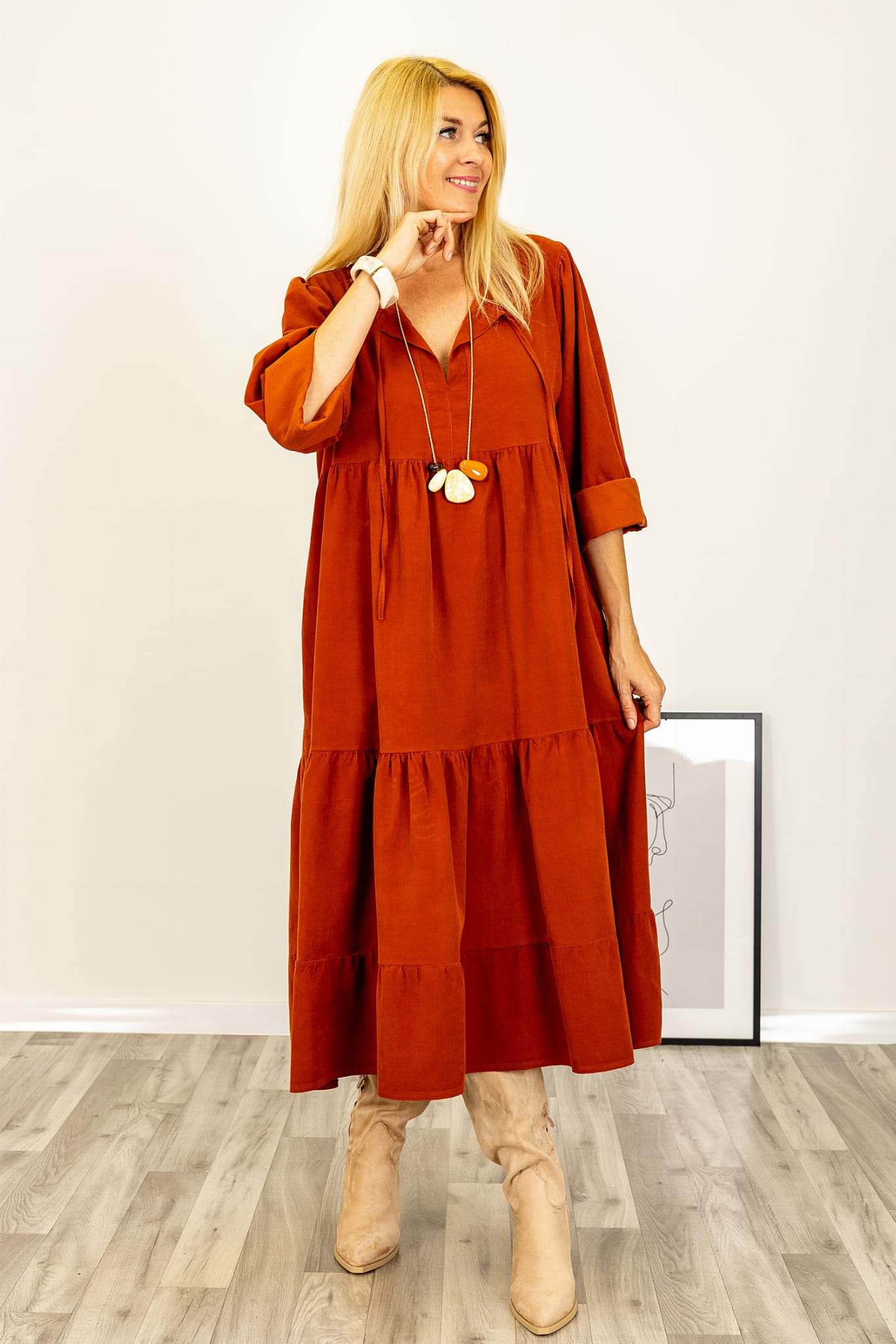 Sukienka midi bawełniana z falbanami i wiązanym dekoltem Sanseveroa ruda
