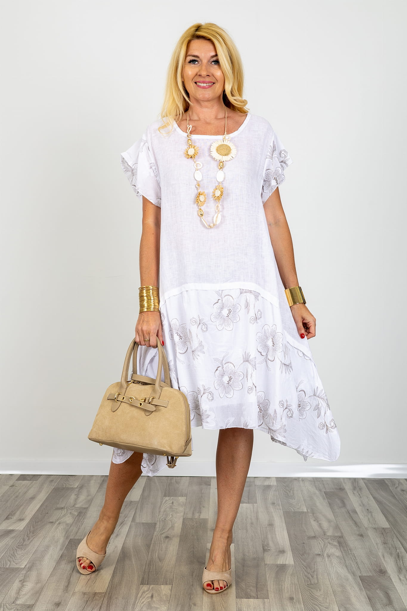 Sukienka midi lniana z krótkim rękawem oversize asymetryczna z haftem kwiatowym Sangemini biała