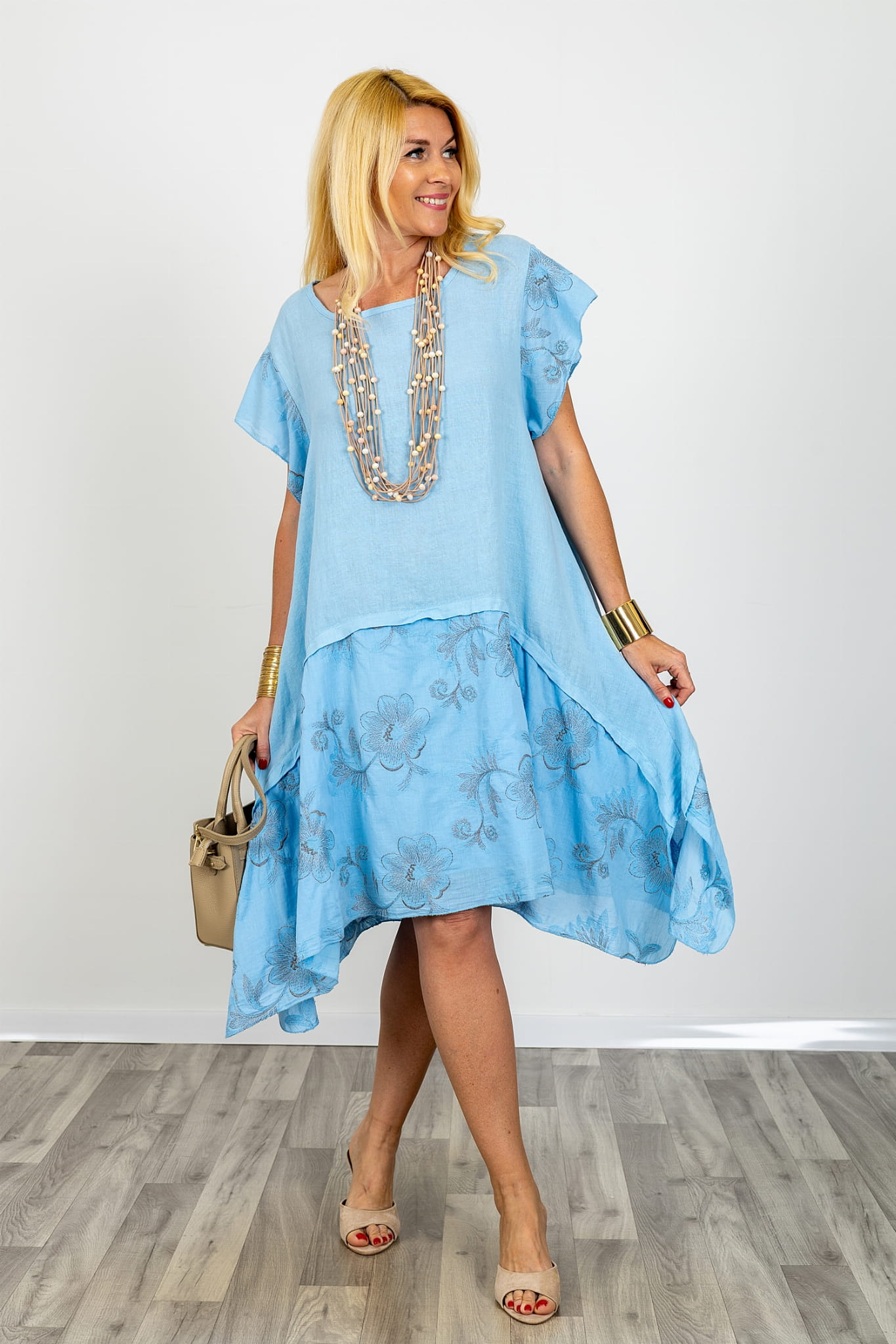 Sukienka midi lniana z krótkim rękawem oversize asymetryczna z haftem kwiatowym Sangemini błękitna