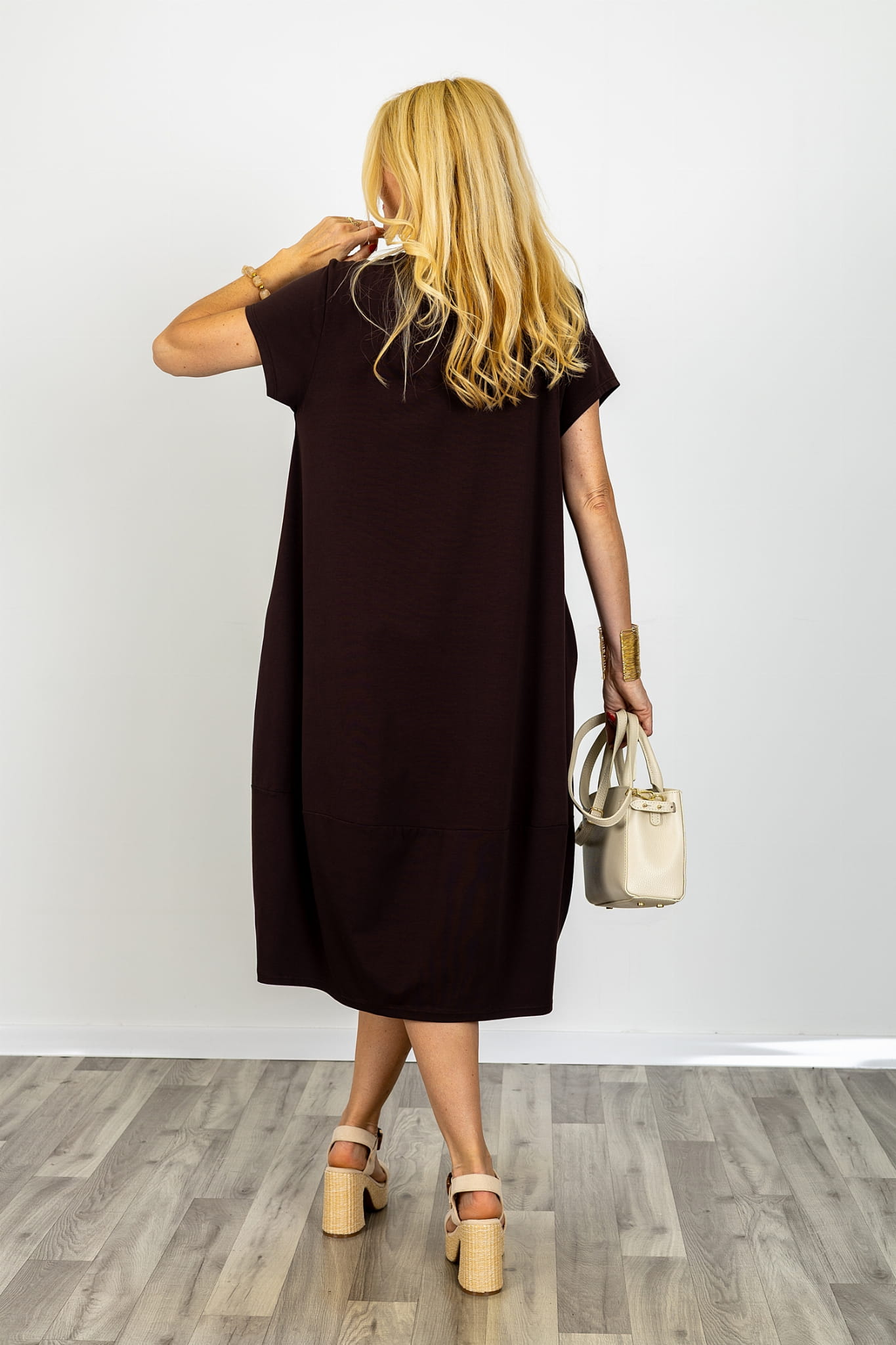 Sukienka midi oversize z krótkim rękawem okrągłym dekoltem i kieszeniami po bokach plus size Valdaora brązowa