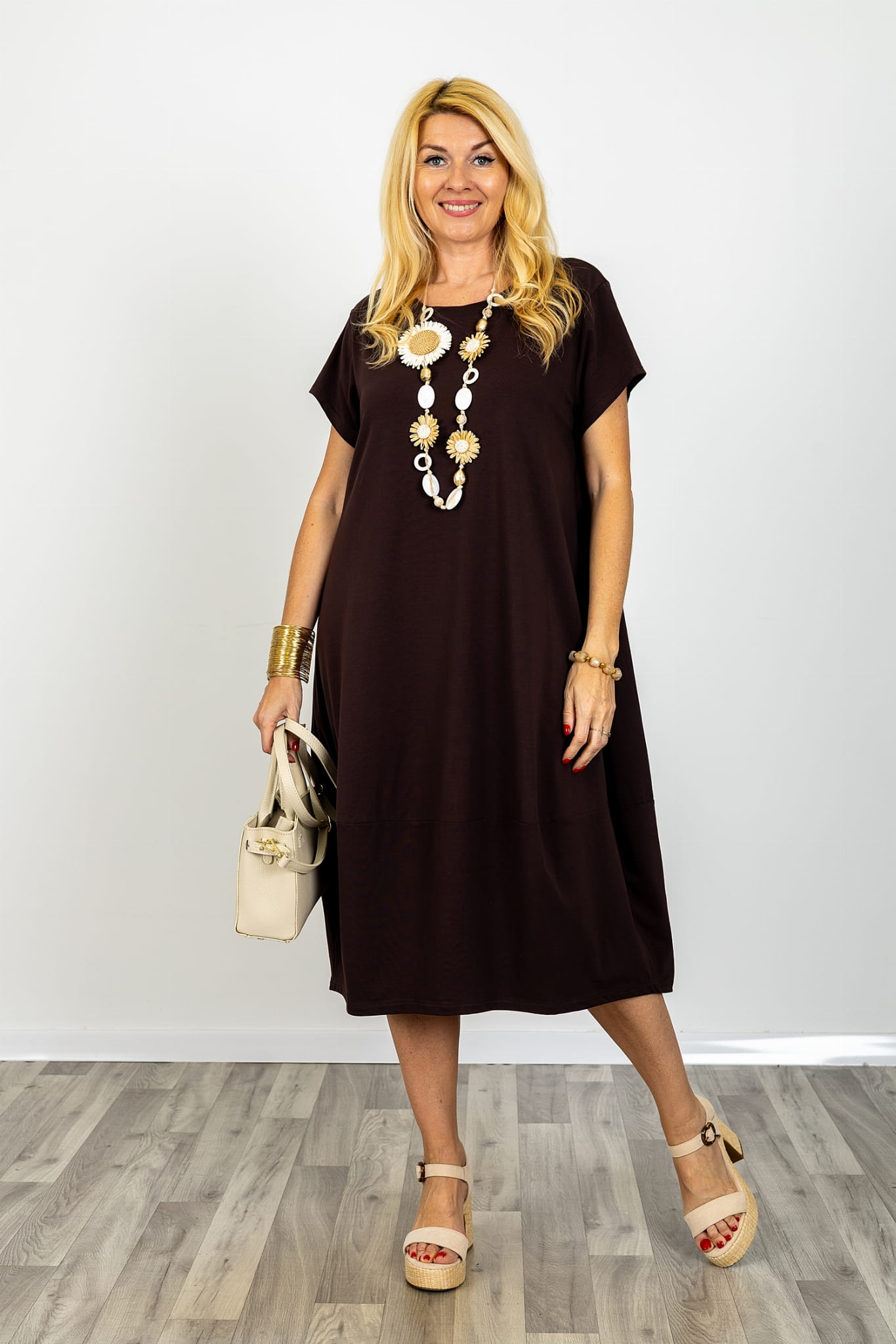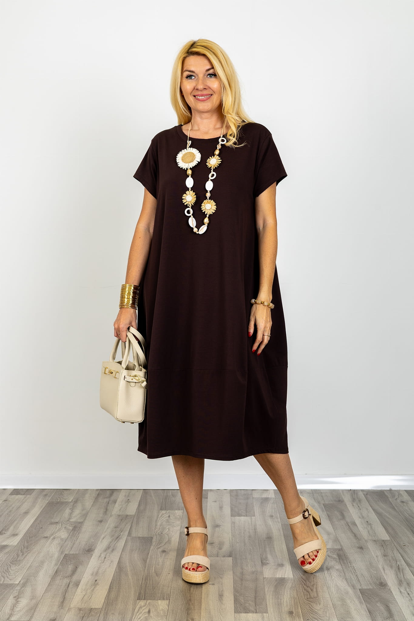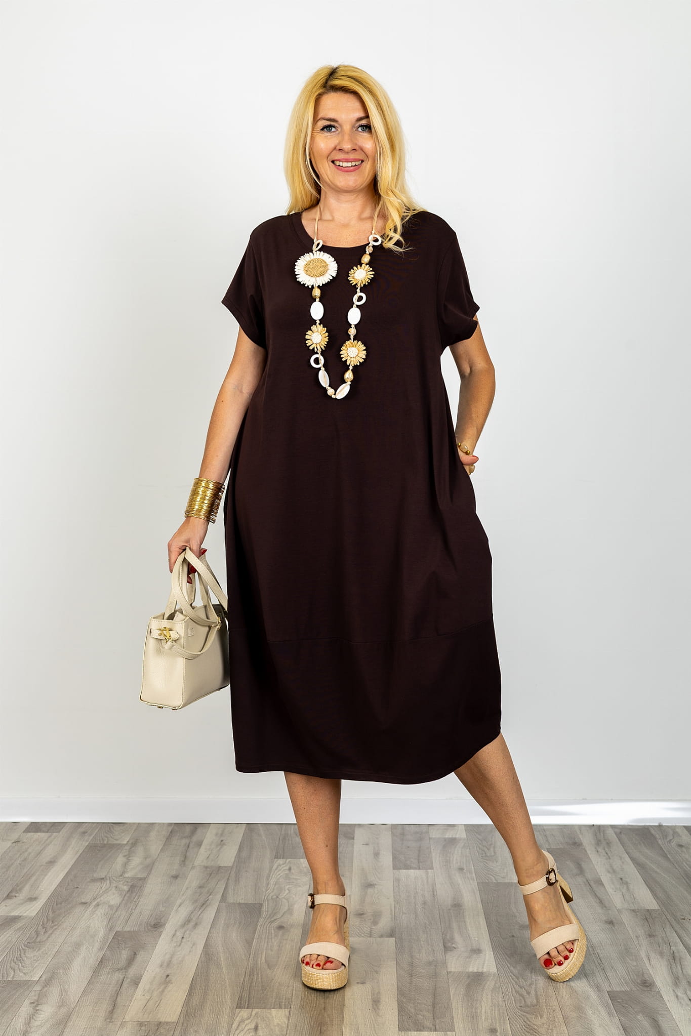 Sukienka plus size midi z krótkim rękawem, kieszeniami po bokach i okrągłym dekoltem w kolorze brązowym.