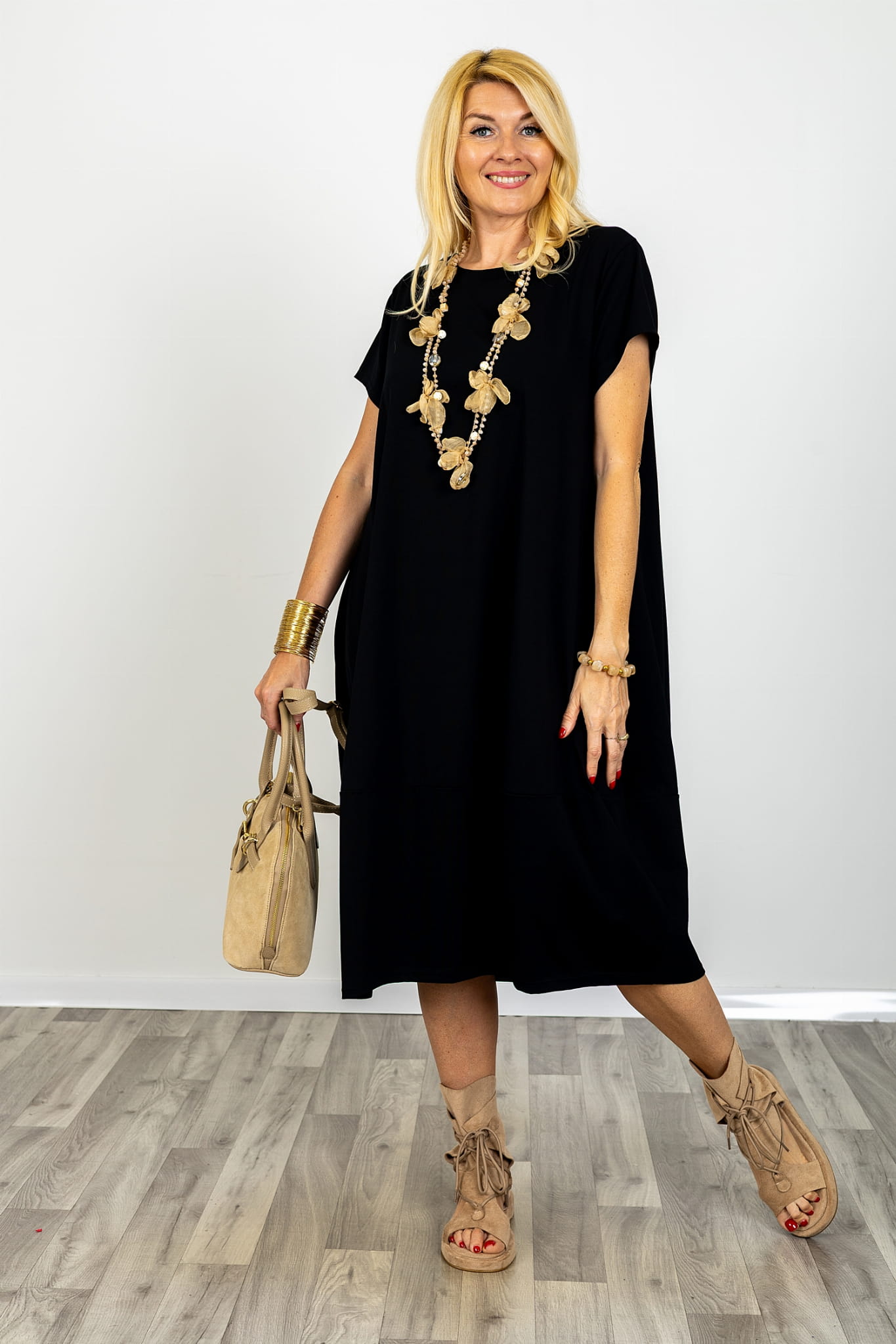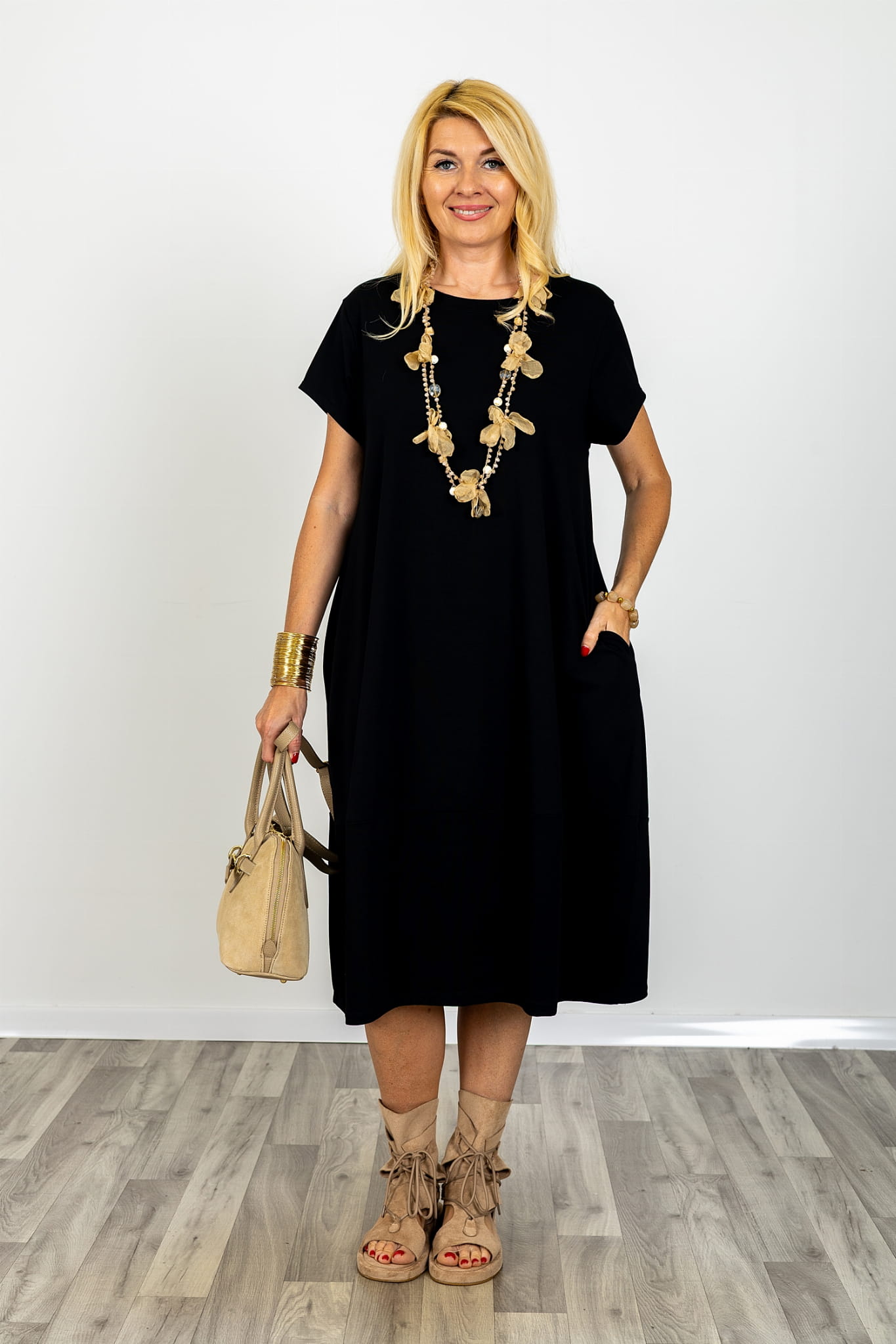 Luźna forma pozwala na swobodny ruch i naturalne ułożenie materiału bez uczucia ograniczenia. Sukienka midi oversize z krótkim rękawem dobrze funkcjonuje w codziennym użytkowaniu, a jej konstrukcja opiera się na prostych rozwiązaniach, które wpływają na wygodę i praktyczne zastosowanie. Taki fason sprawia, że sukienka damska luźna midi pozostaje funkcjonalna i łatwa w stylizowaniu.
