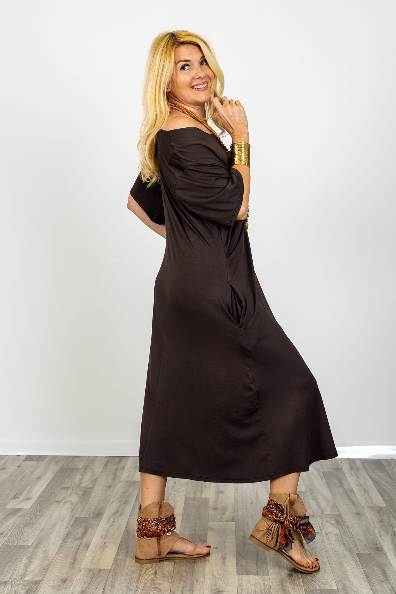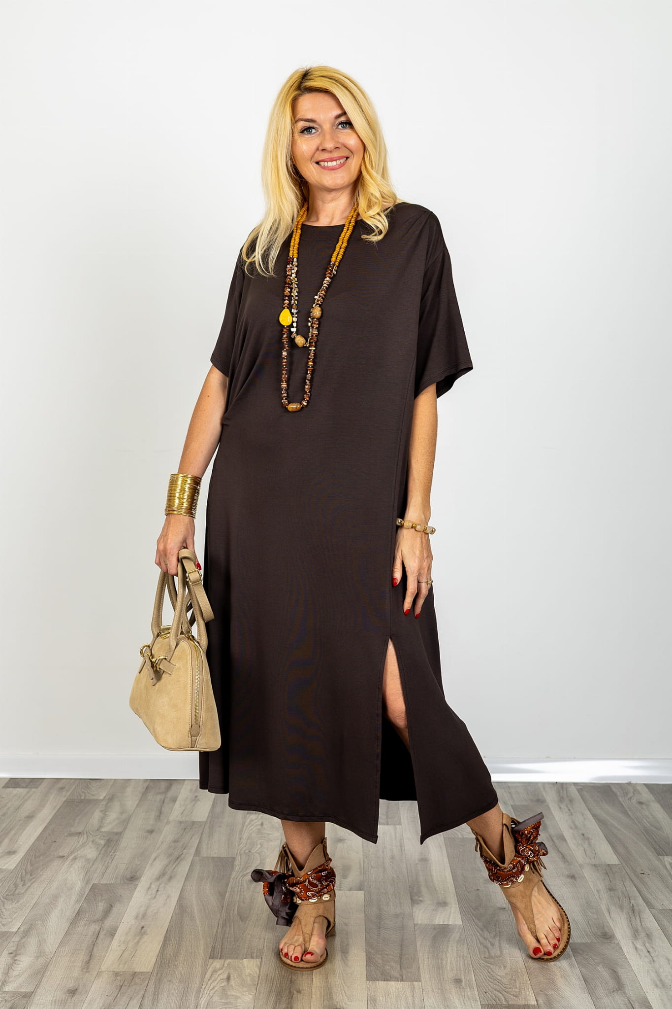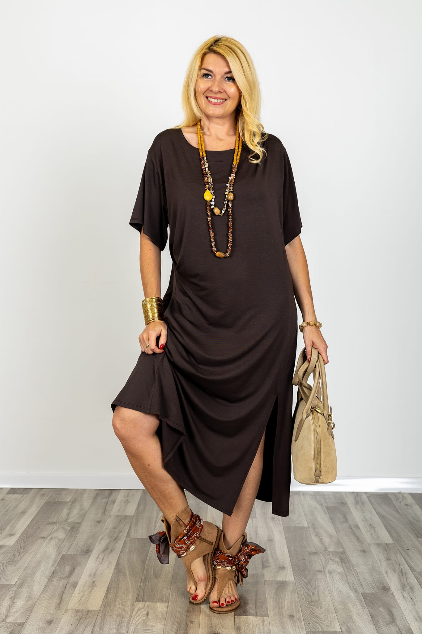 To luźna sukienka midi brązowa, która tworzy gotową stylizację bez wysiłku. Sprawdzi się na co dzień, do pracy i podczas wyjazdów, kiedy liczy się wygoda oraz spójny, dopracowany wygląd.