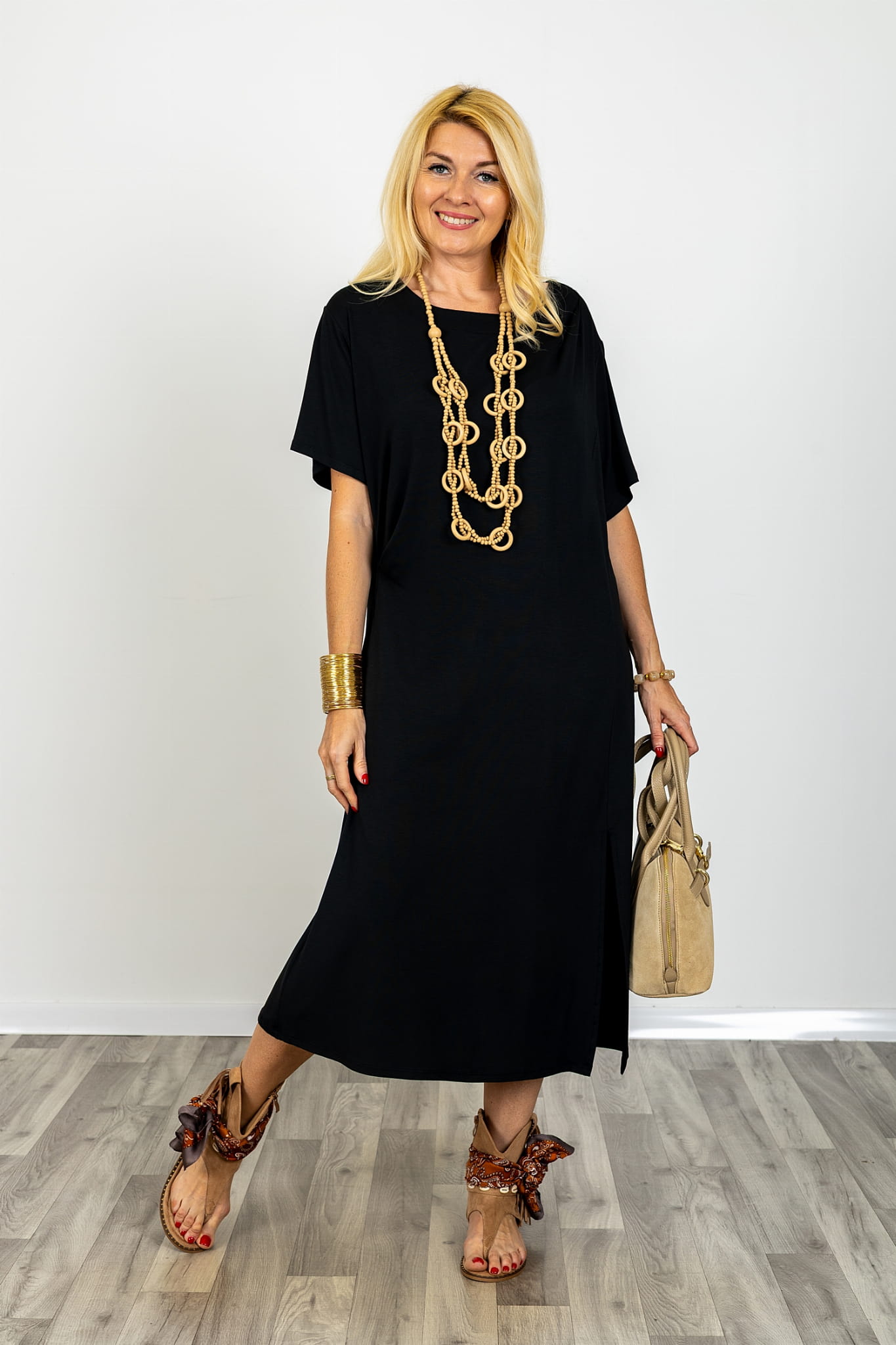 To luźna sukienka midi czarna, która tworzy gotową stylizację bez wysiłku. Sprawdzi się na co dzień, do pracy i na wyjazdy, kiedy liczy się wygoda, spójny wygląd i łatwość stylizacji.