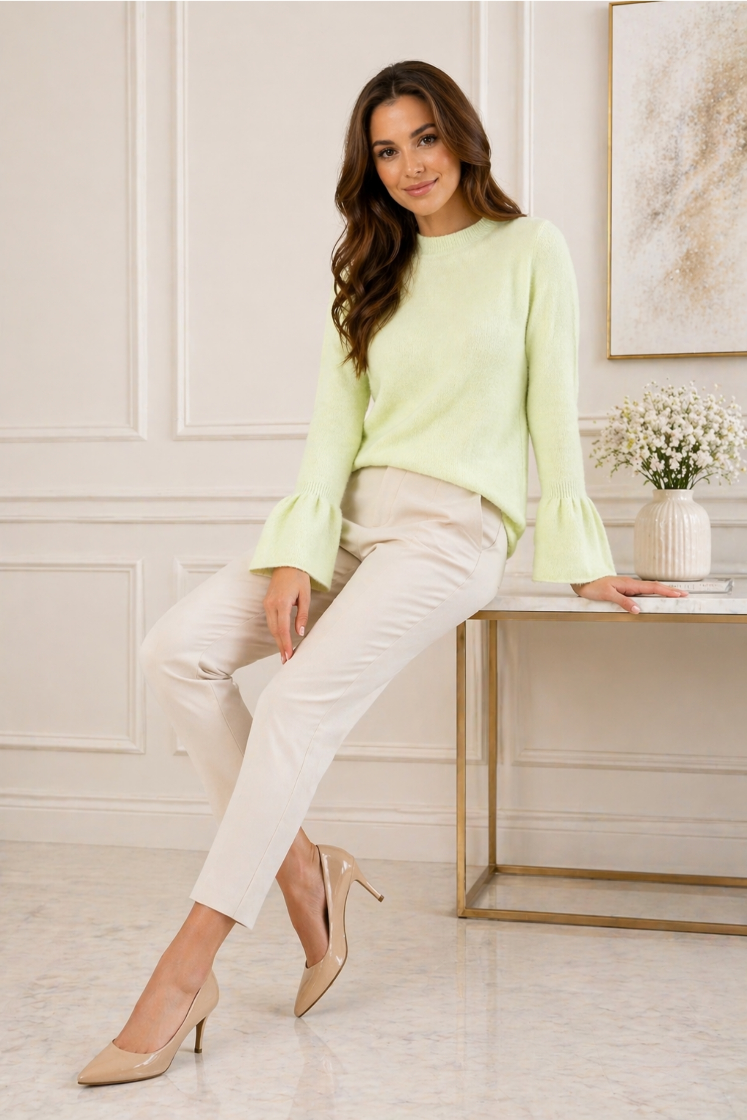 Sweter damski pistacjowy z okrągłym dekoltem i rękawami zakończonymi falbanką Sassinoro