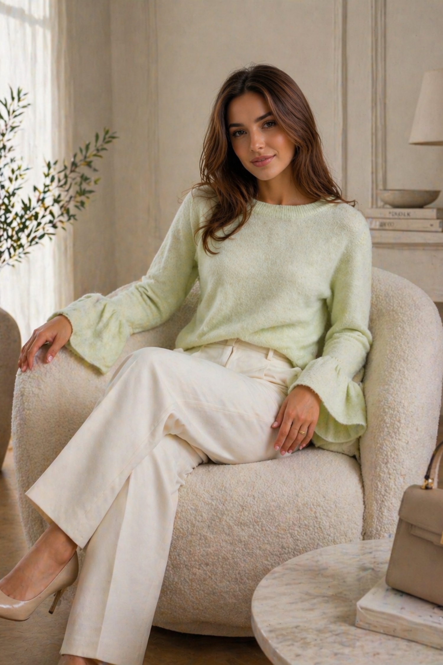 Sweter damski pistacjowy z okrągłym dekoltem i rękawami zakończonymi falbanką to rozwiązanie dla kobiet, które chcą wprowadzić do stylizacji świeżość i lekkość koloru bez rezygnacji z wygody. Odcień pistacjowy rozjaśnia wygląd i nadaje całości promienny, wiosenny charakter.