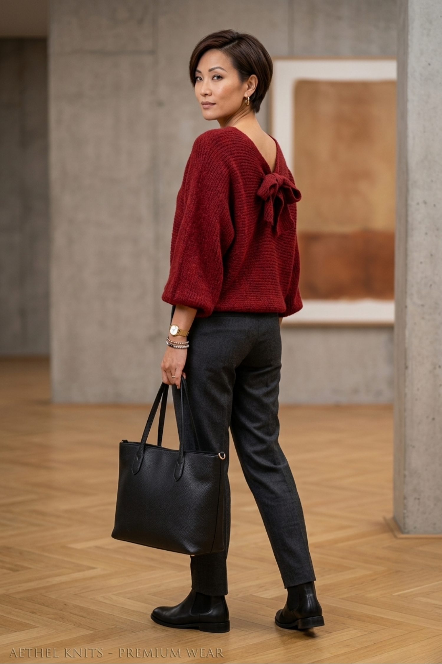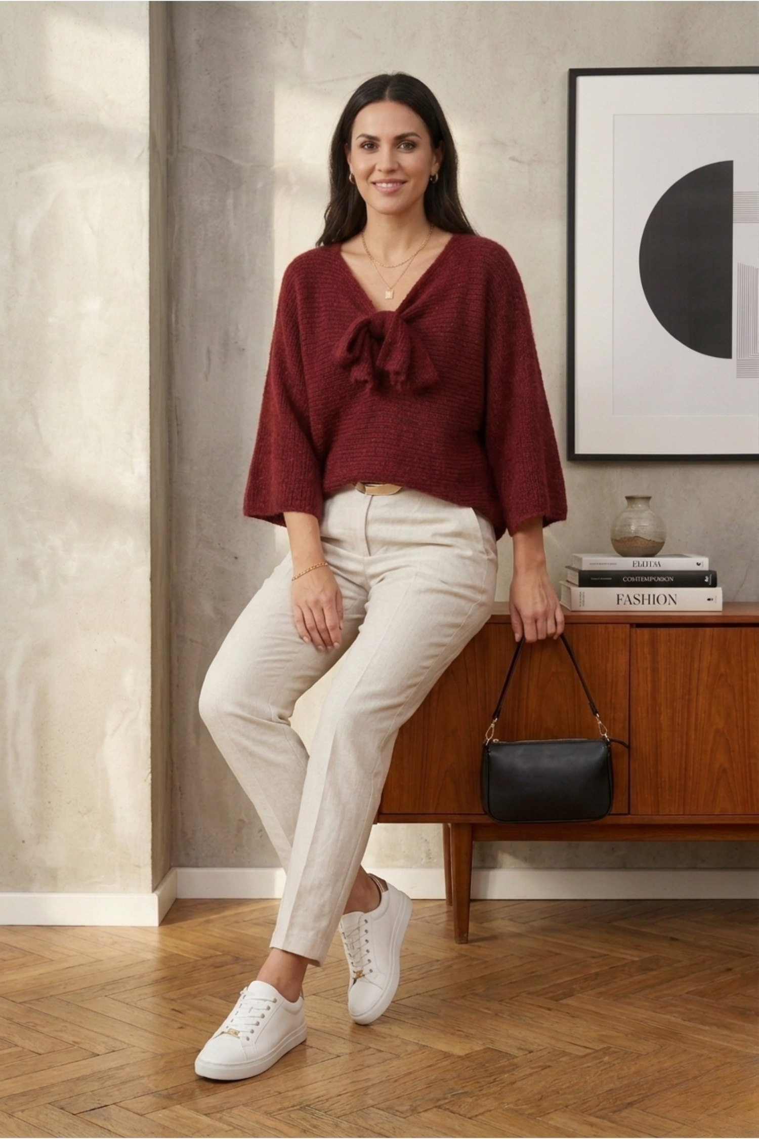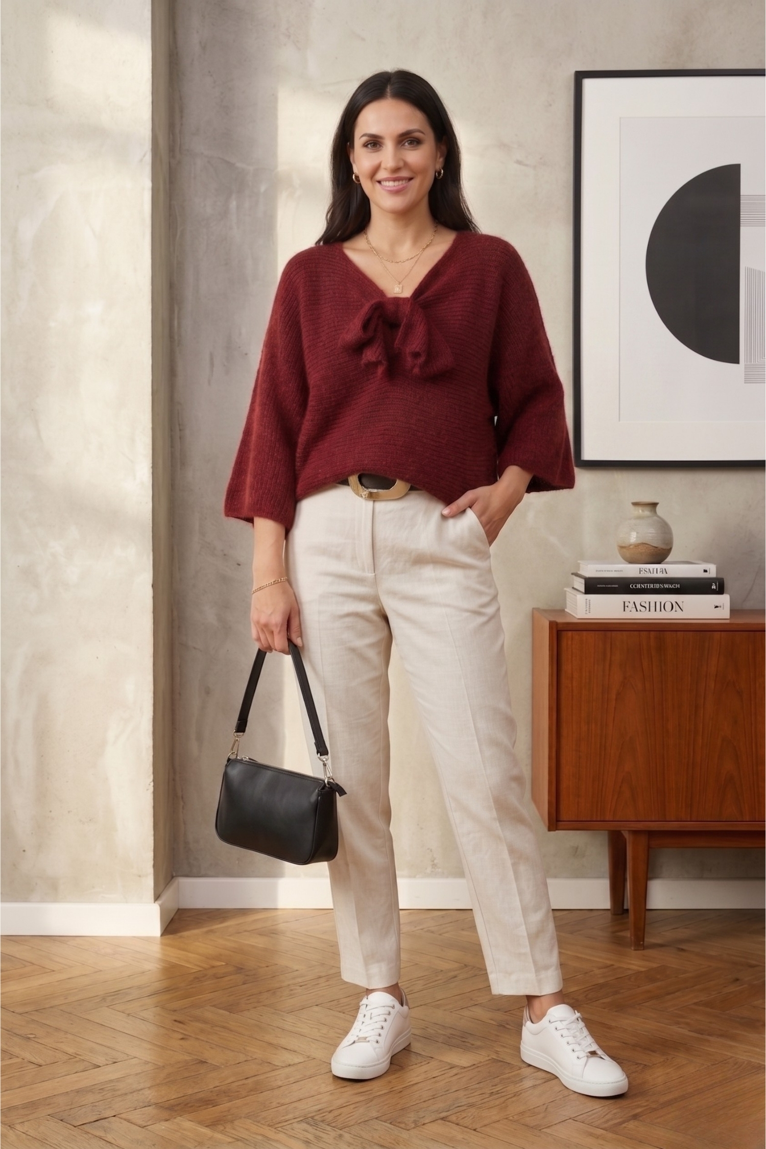 Ten sweter damski wiśniowy oversize z wiązaniem w kokardę przyciąga uwagę świeżym, energetycznym kolorem, który idealnie wpisuje się w wiosenny klimat. Odcień wiśniowy ożywia stylizację, dodaje jej wyrazistości i sprawia, że całość wygląda promiennie i kobieco.