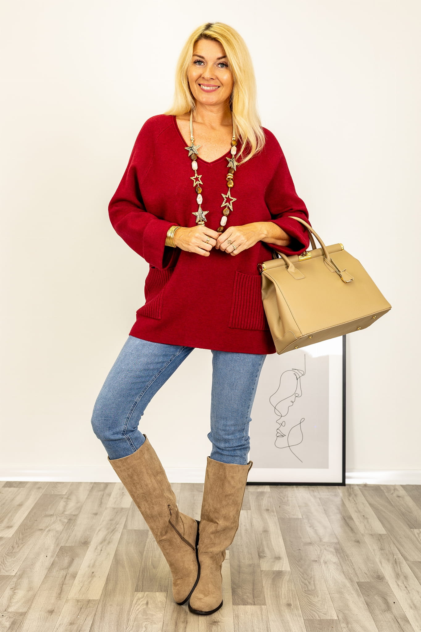 Sweter oversizowy z prążkowanymi kieszeniami i dekoltem V Cirimidoa bordowy