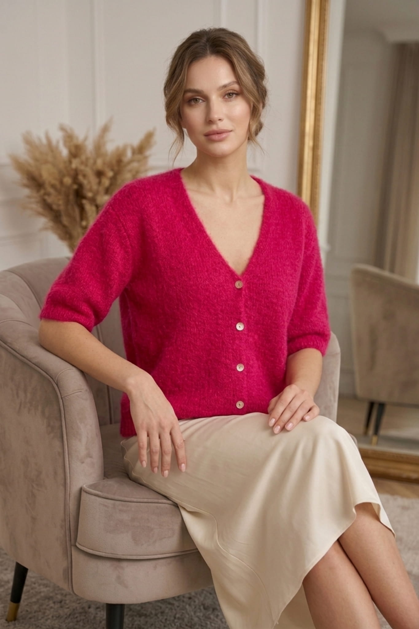 Sweter damski fuksja na guziki z dekoltem V to doskonała baza do wiosennych i letnich stylizacji. Bluzka sweterkowa damska fuksja przyciąga uwagę intensywnym kolorem, który podkreśla kobiecy styl i dodaje energii każdej stylizacji. Kardigan damski fuksja krótki rękaw sprawdzi się zarówno w ciągu dnia, jak i w chłodniejsze wieczory.