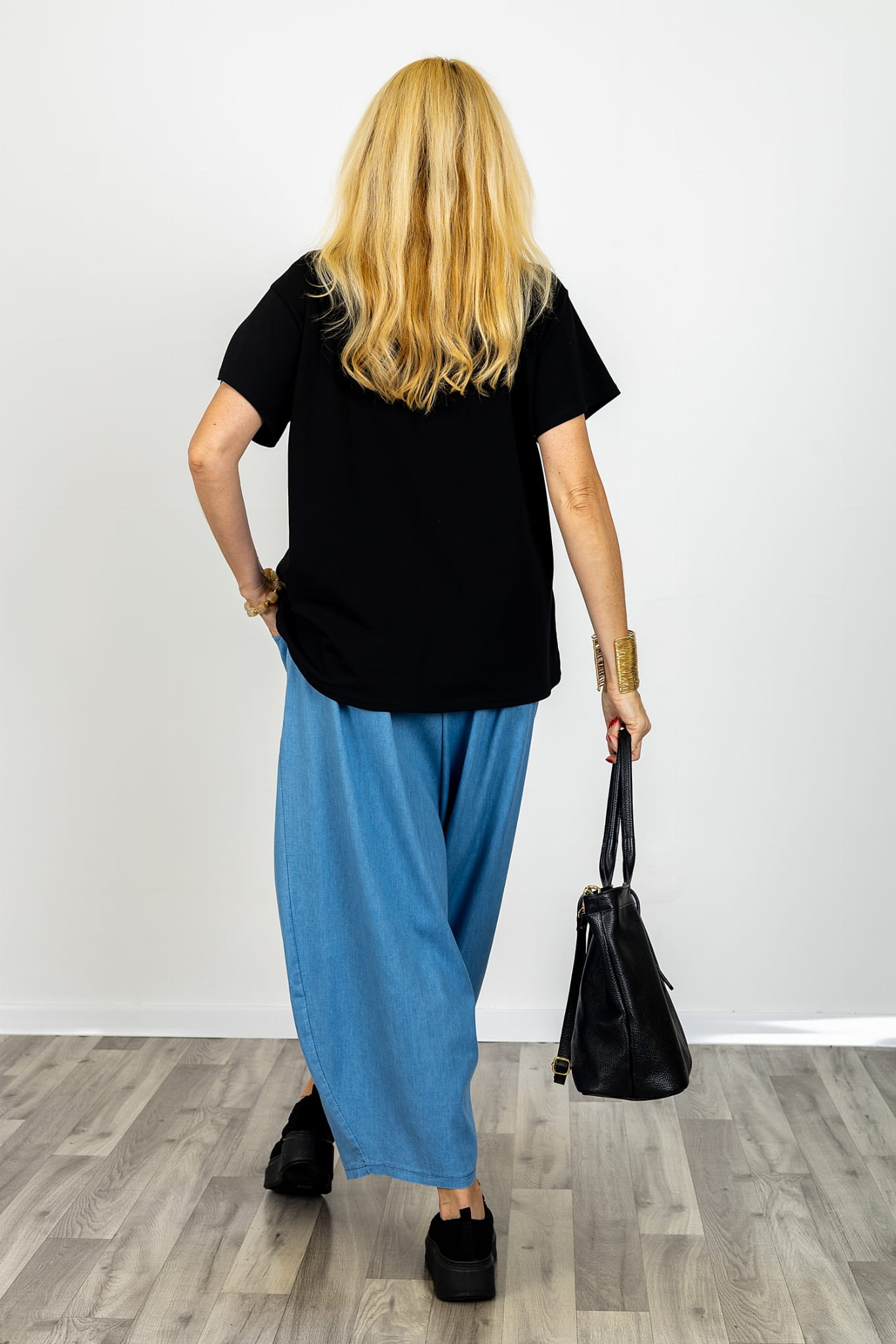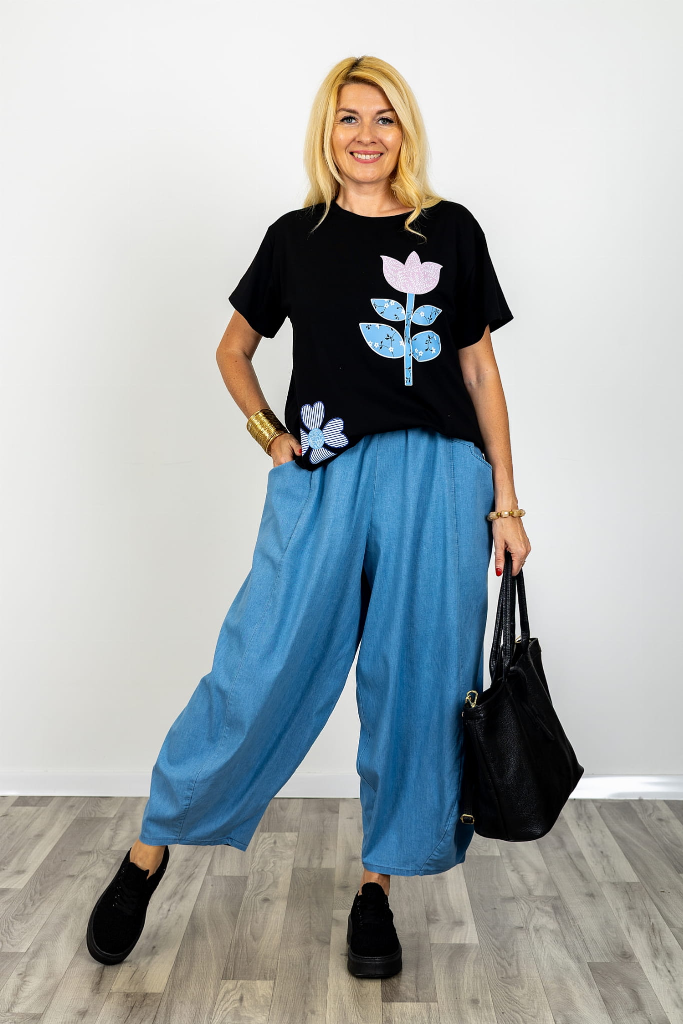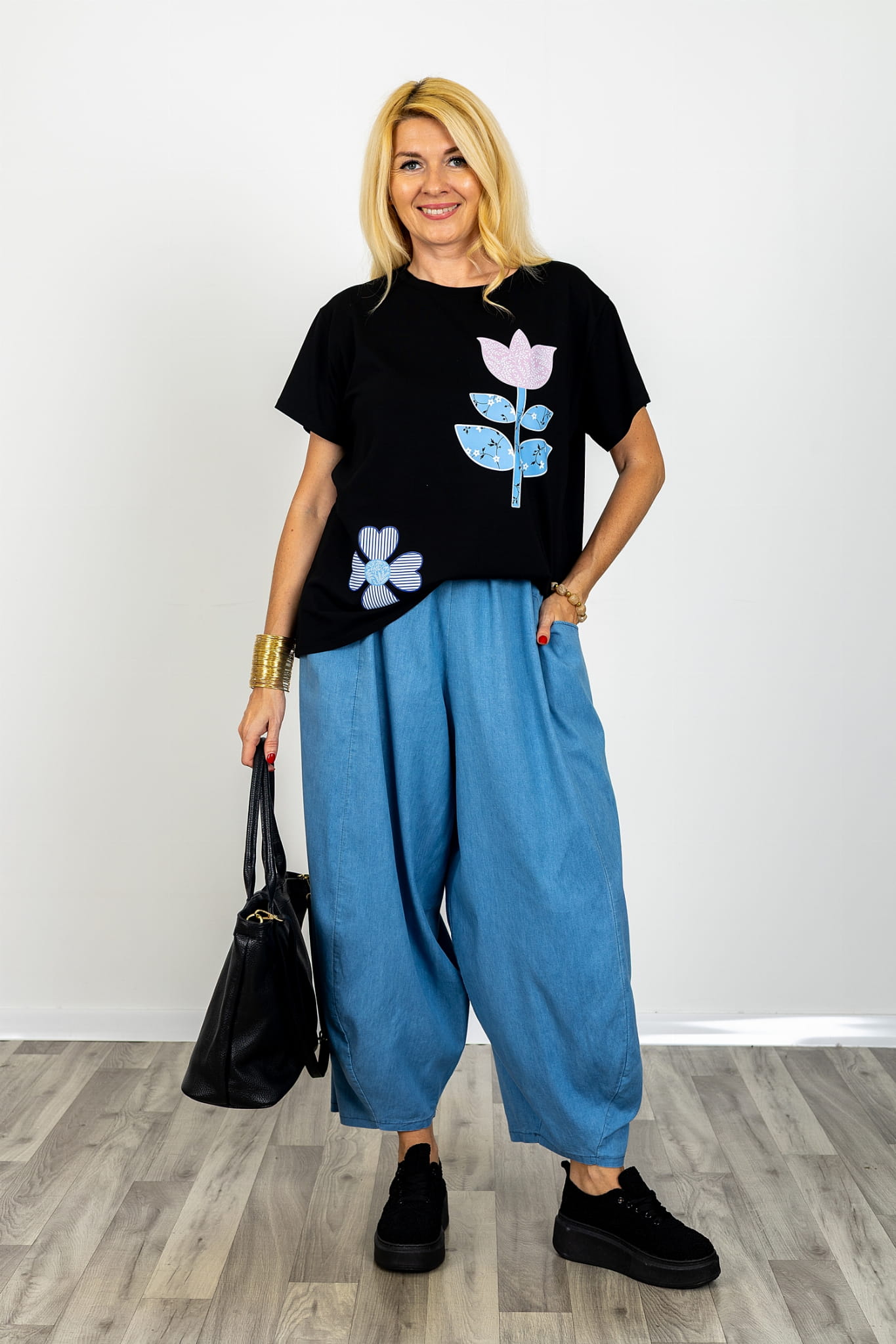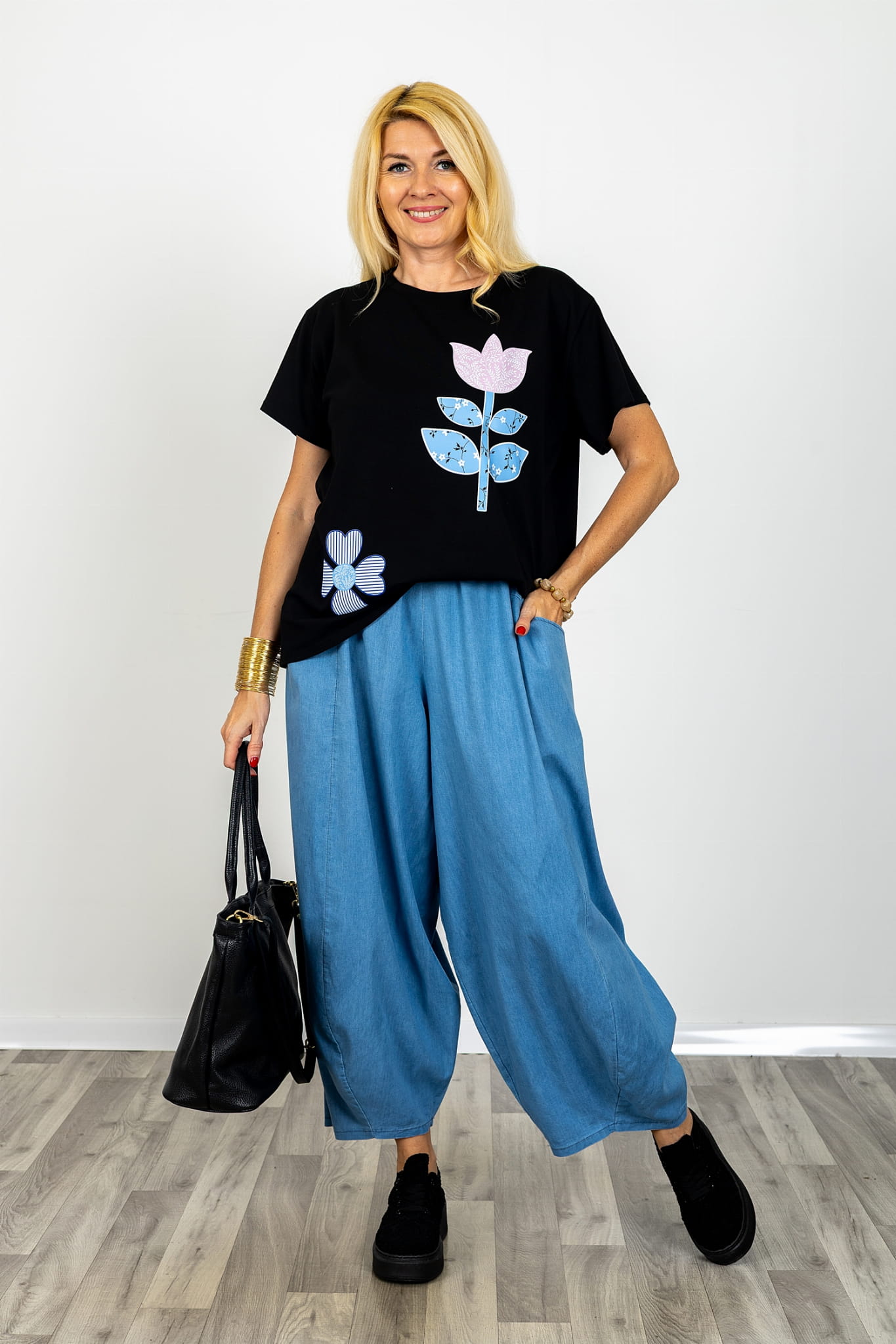 Czarny t-shirt damski z motywem kwiatowym to model wykonany z bawełny o gładkiej powierzchni i jednolitej strukturze. Materiał naturalny dobrze sprawdza się w codziennym użytkowaniu, a jego charakter podkreśla prostotę formy i wykończenia. Ciemna baza stanowi kontrast dla nadruku, dzięki czemu wzór jest wyraźnie widoczny.