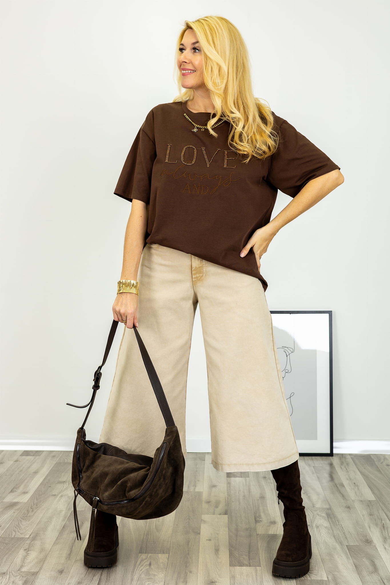 T-shirt z krótkim rękawem z napisem Love z koralików i dekoracyjnym łańcuszkiem Lugnacco brązowy