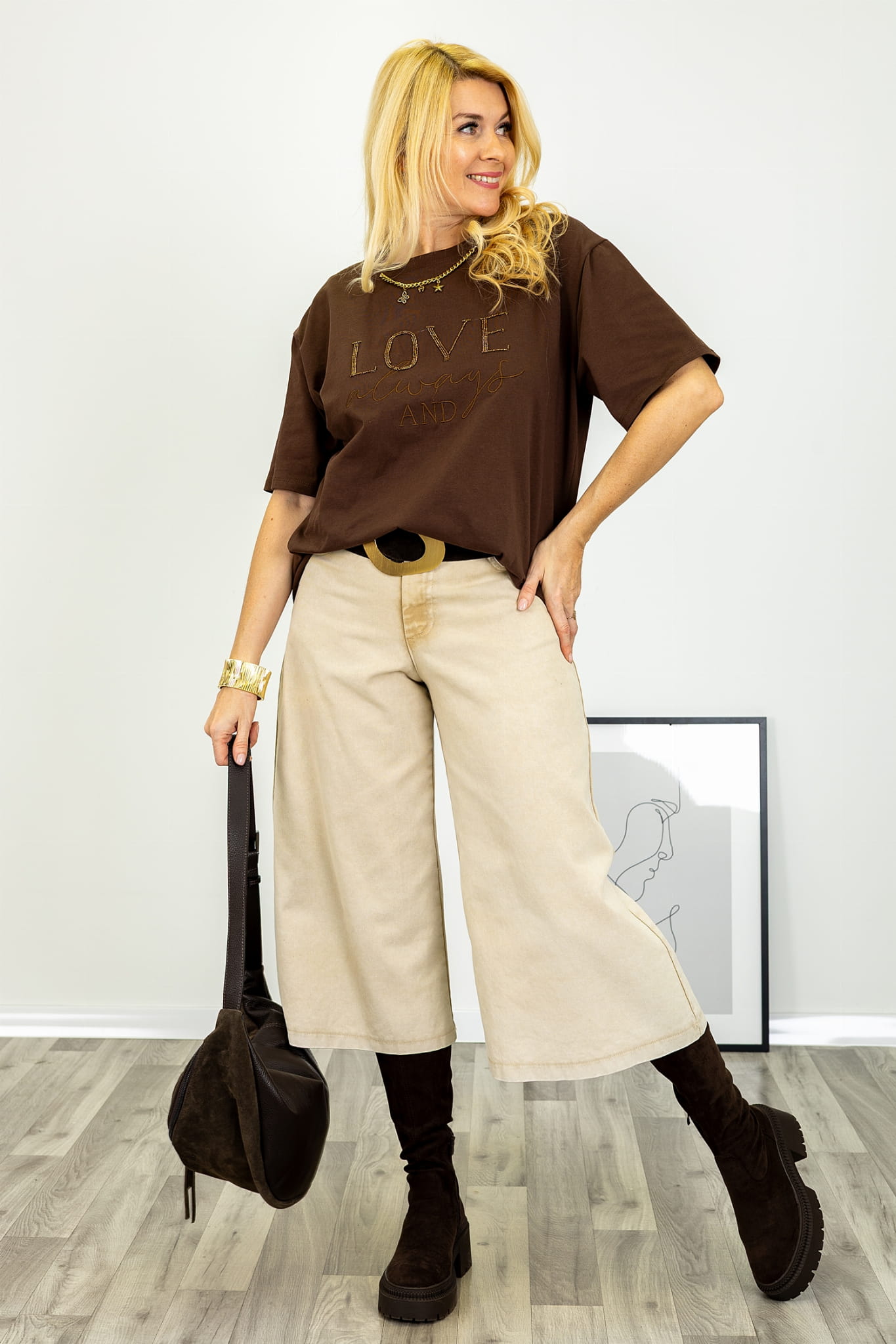T-shirt Lugnacco to wyrazista propozycja, w której klasyczna forma została wzbogacona o dekoracyjny detal o biżuteryjnym charakterze. Model przyciąga uwagę efektownym napisem „LOVE” wykonanym z drobnych koralików, które tworzą spójną i estetyczną kompozycję na przodzie. Uzupełnieniem nadruku jest subtelny napis oraz ozdobny łańcuszek umieszczony przy dekolcie, nadający całości dopracowanego i oryginalnego wyrazu.