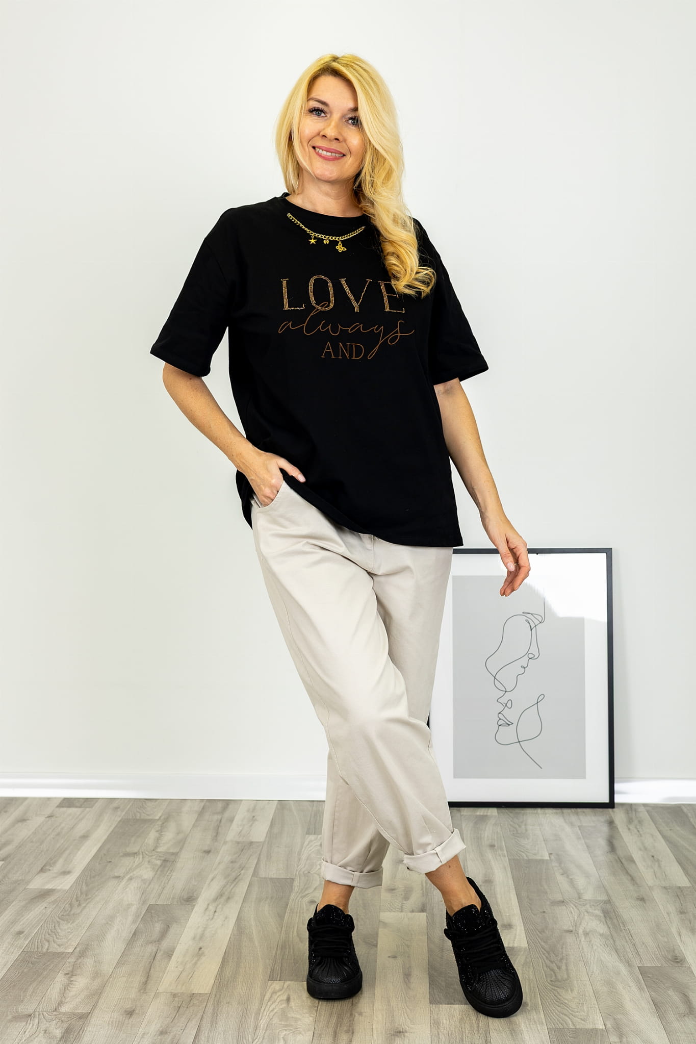 T-shirt Lugnacco to wyrazista propozycja, w której klasyczna forma została wzbogacona o dekoracyjny detal o biżuteryjnym charakterze. Model przyciąga uwagę efektownym napisem „LOVE” wykonanym z drobnych koralików, które tworzą spójną i estetyczną kompozycję na przodzie. Uzupełnieniem nadruku jest subtelny napis oraz ozdobny łańcuszek umieszczony przy dekolcie, nadający całości dopracowanego i oryginalnego wyrazu.