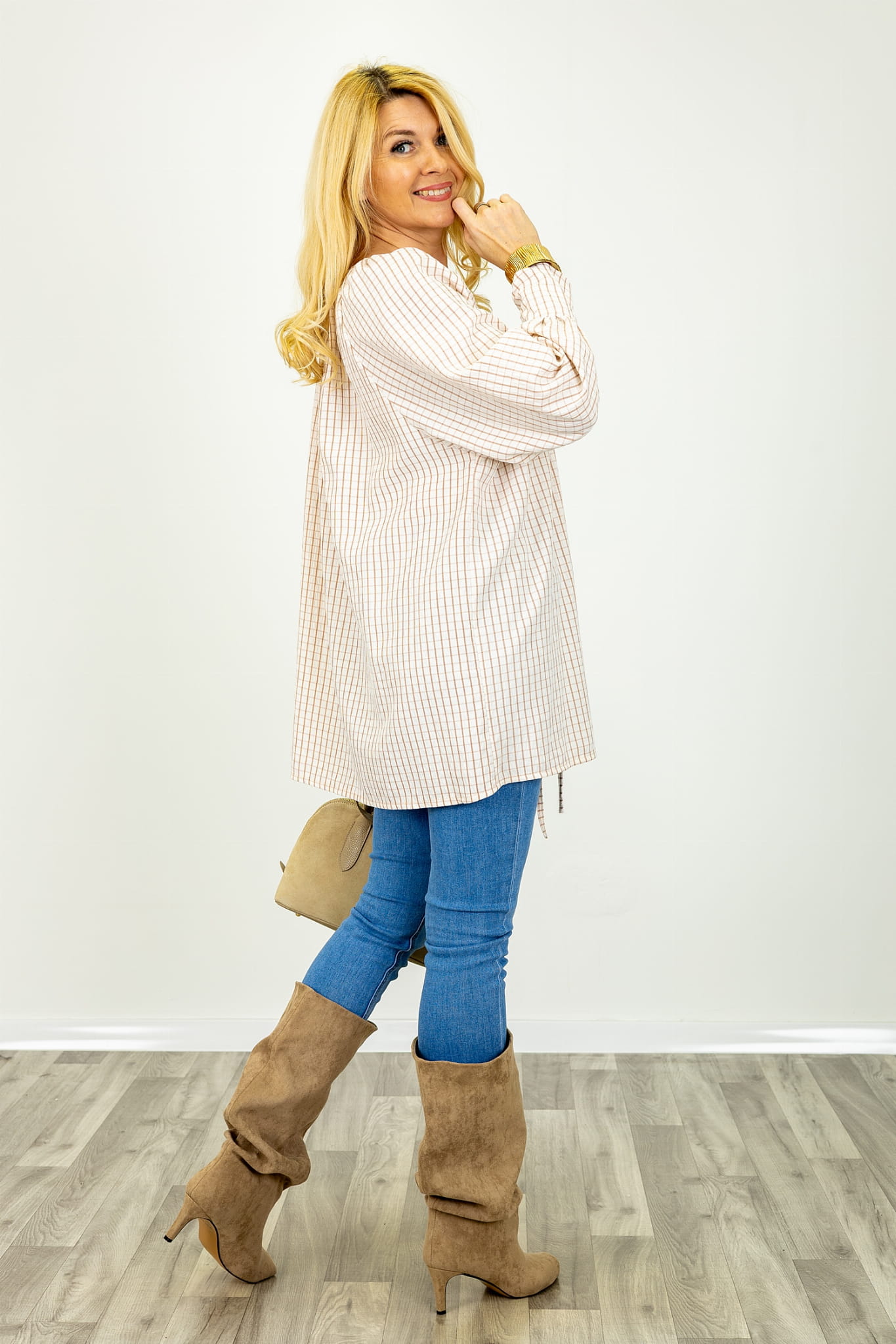 Tunika Rigomagnoa w kratkę zapinana na guziki hiszpanka wiązany dekolt beżowa