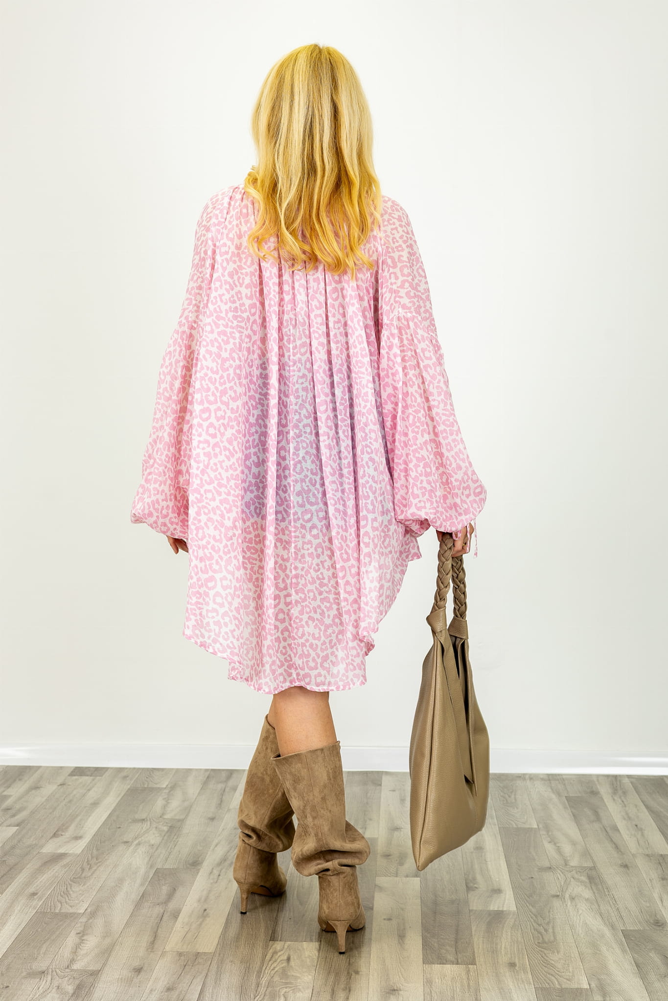 Tunika asymetryczna w cętki mega oversize z obniżoną linią ramion wiązanymi rękawami i dekoltem V Sovicille różowa