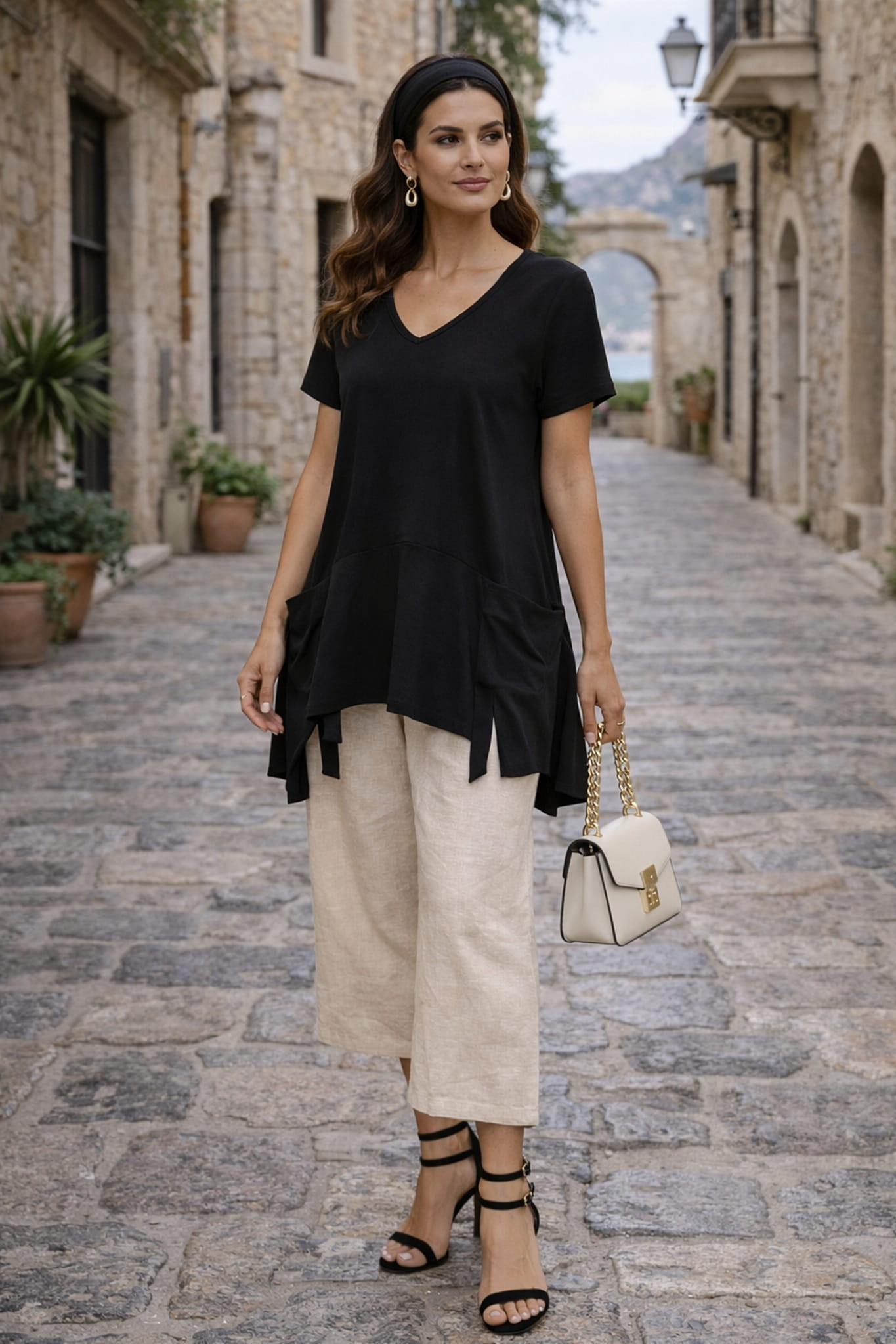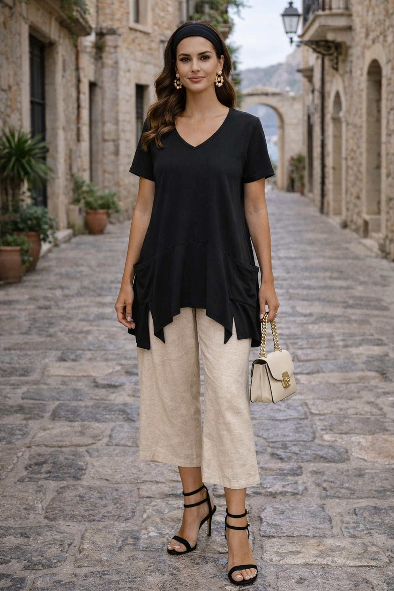 Tunika damska oversize z krótkim rękawem i dekoltem V wpływa na proporcje górnej części sylwetki. Bluzka plus size damska z dekoltem V podkreśla linię szyi i nadaje całości lekkości. Tunika damska plus size oversize z asymetrycznym dołem i rozcięciami łączy wygodę z nowoczesnym fasonem.