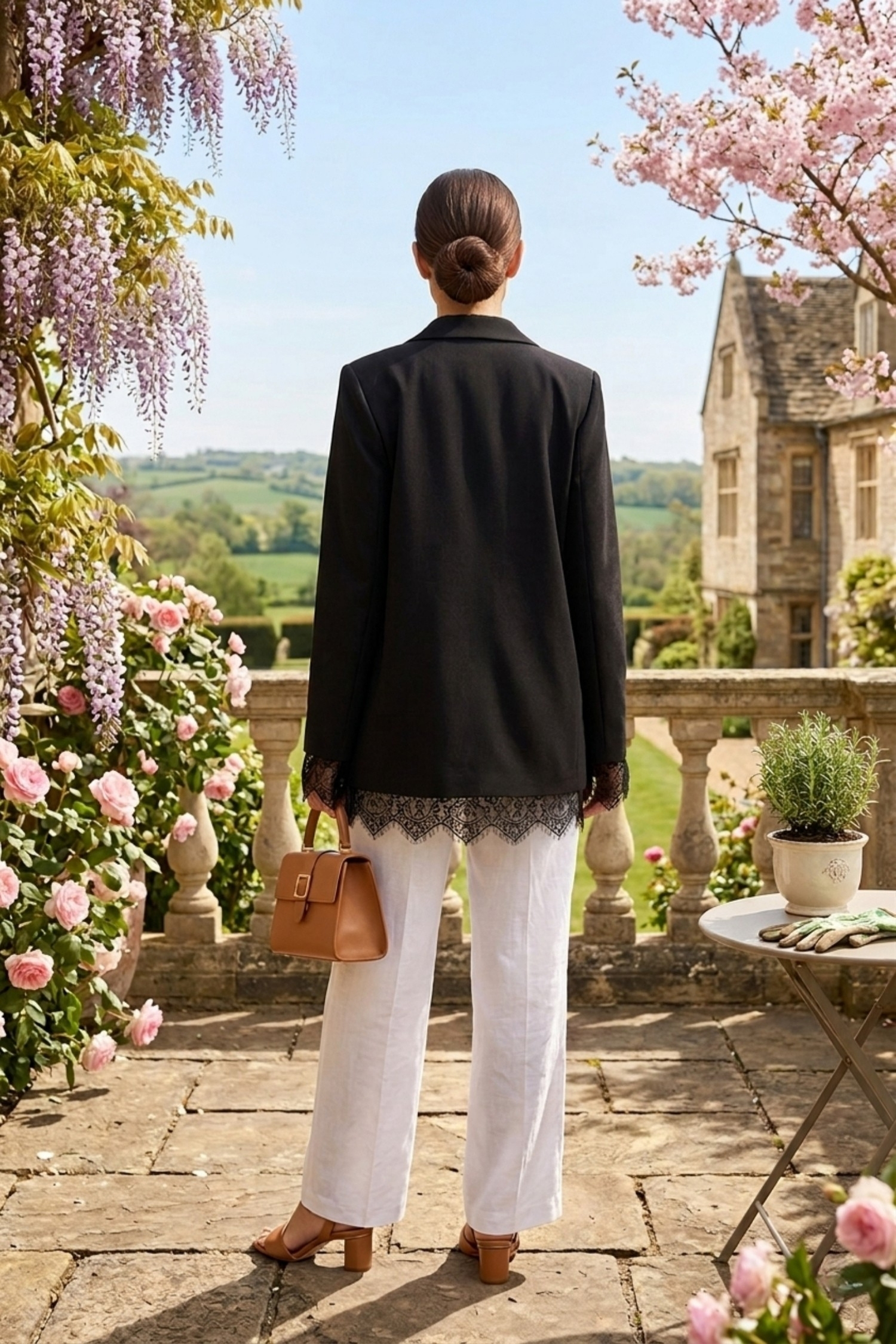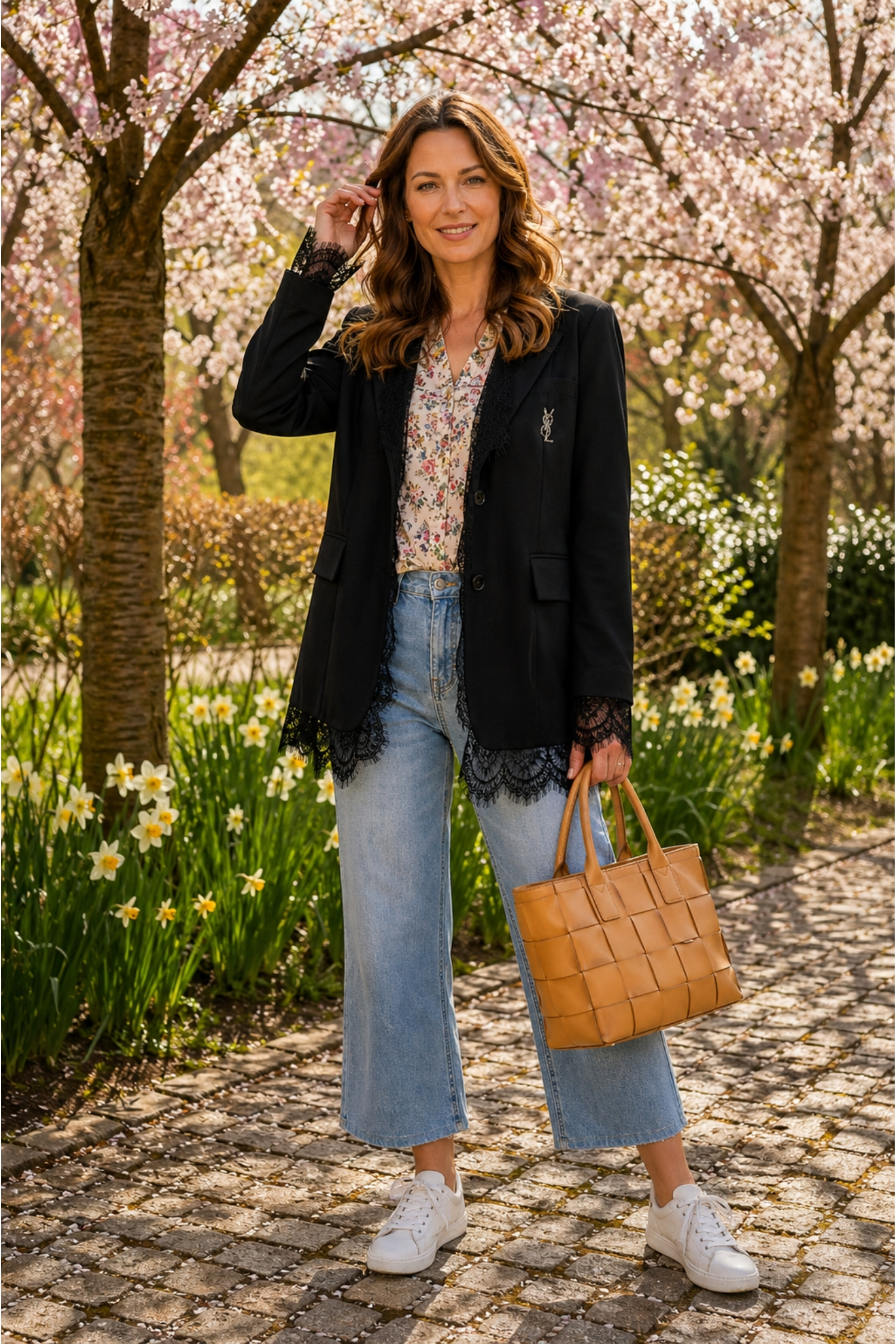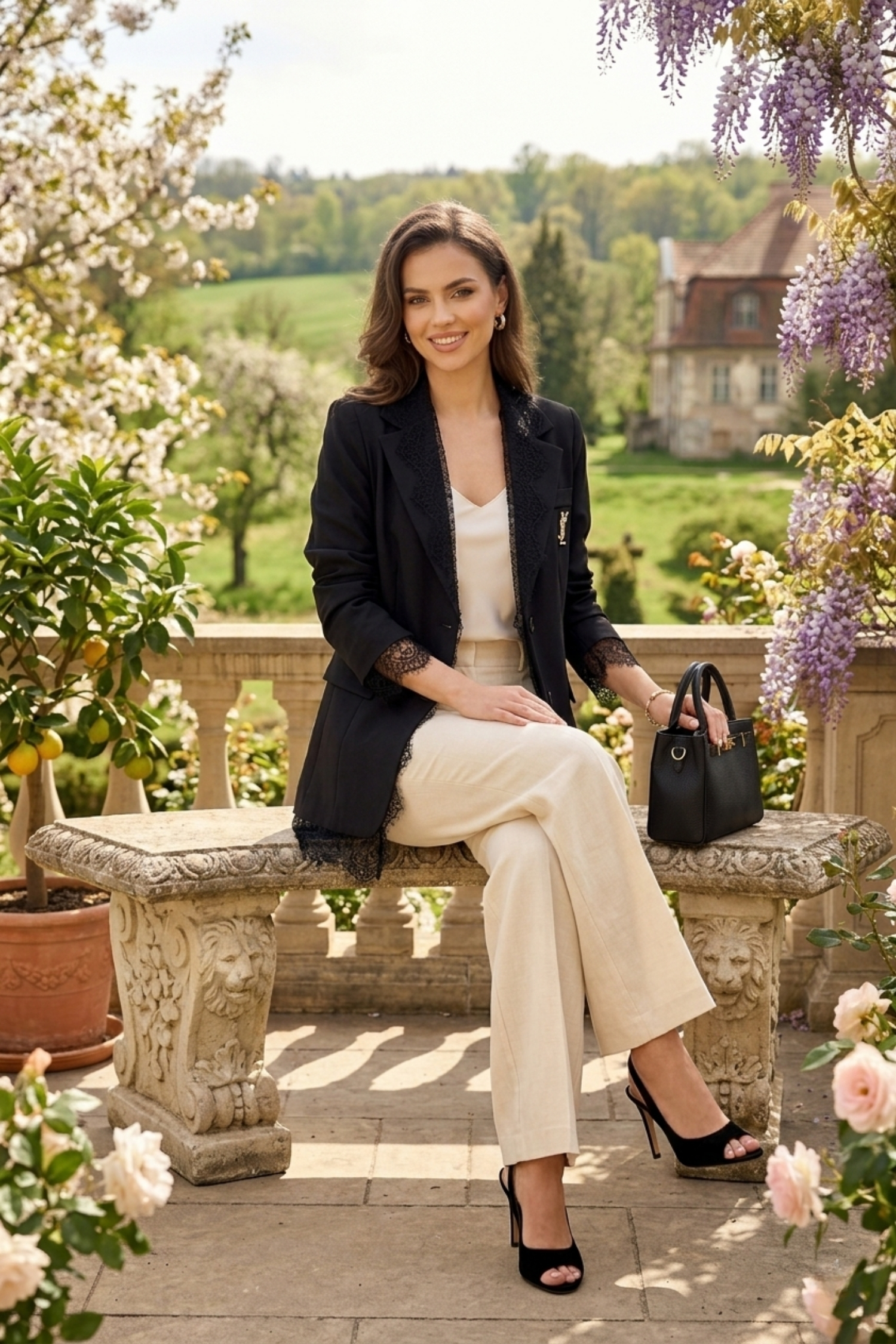 Żakiet czarny z koronkowym wykończeniem i srebrną aplikacją marynarka z kieszeniami zapinana na guziki Pietranico