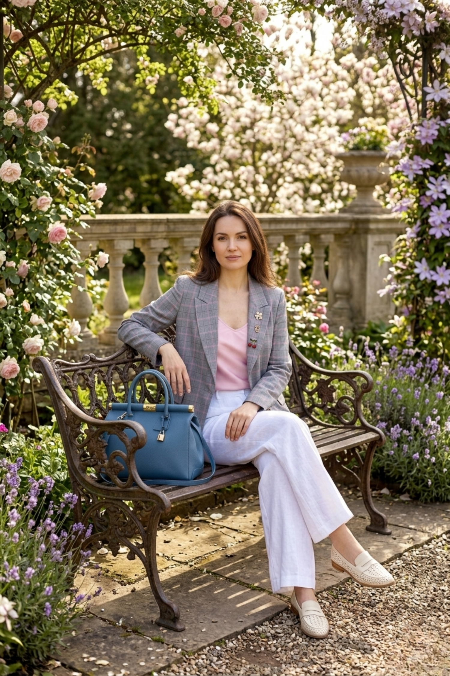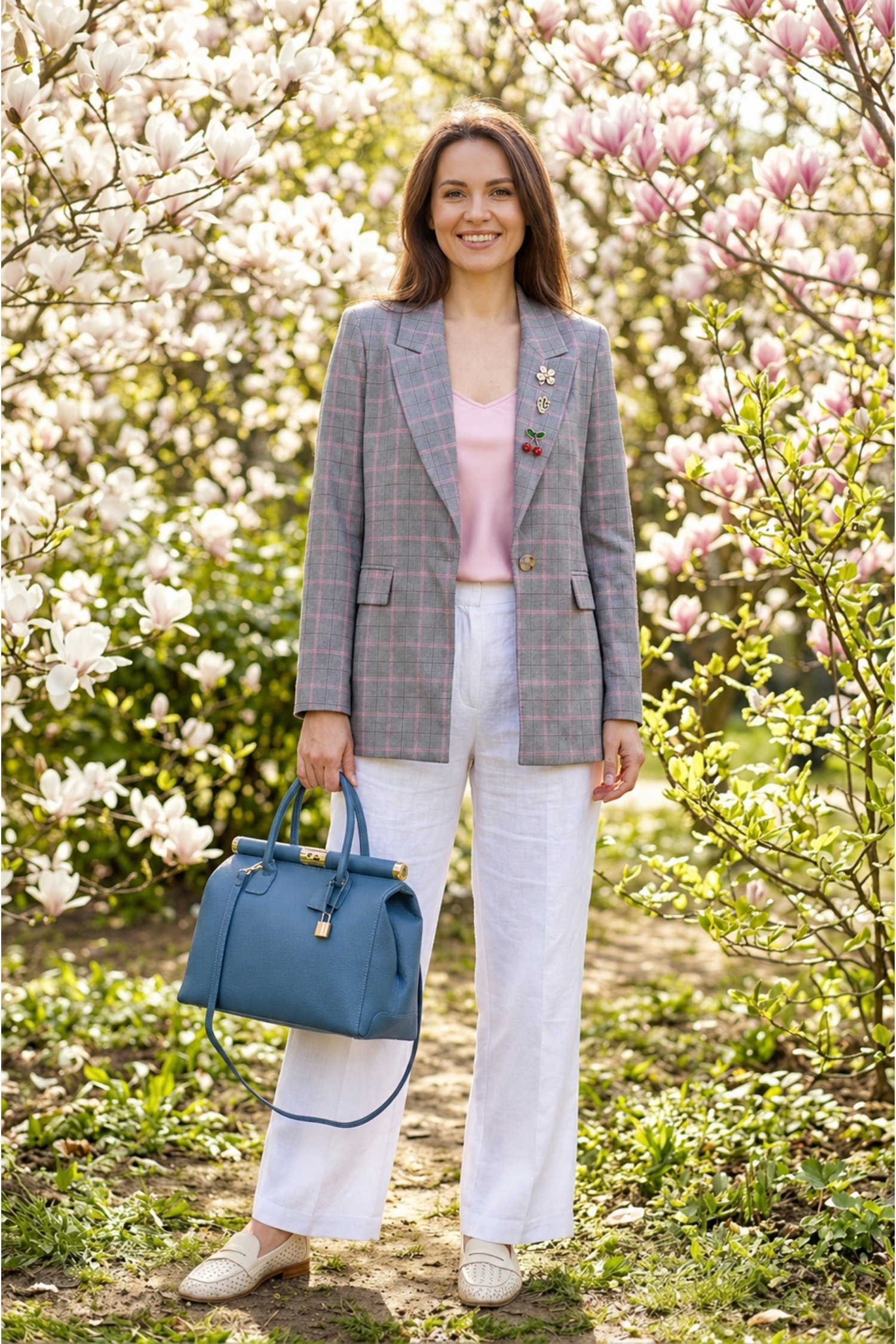 • klasyczny żakiet w kratę w odcieniu szarości z różowym akcentem