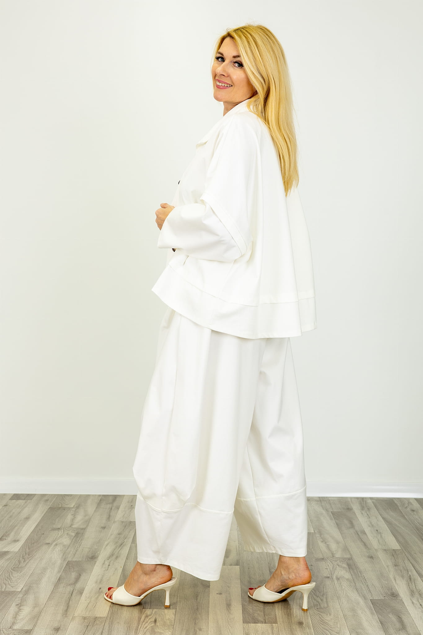 Żakiet narzutka oversize na guziki rękaw kimono asymetryczny dół ozdobne przeszycia Montignosa biały