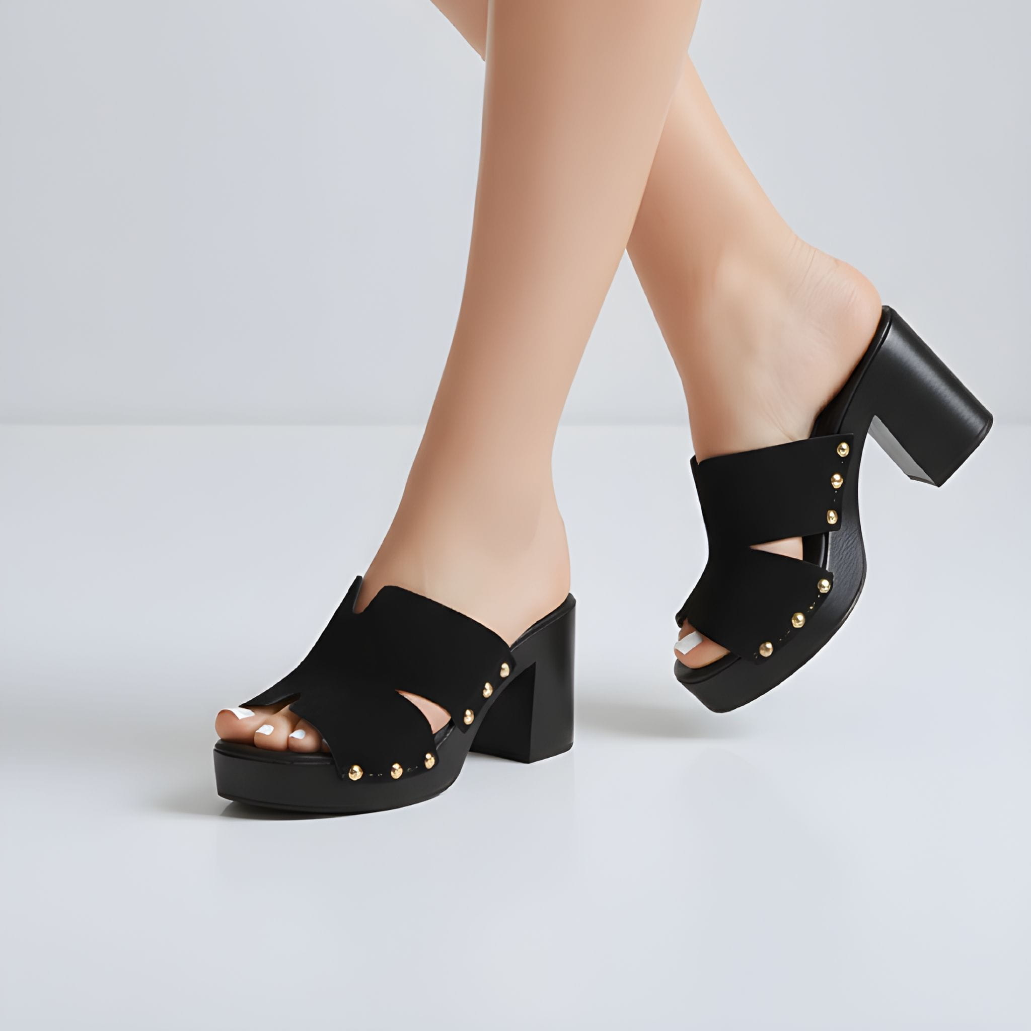 Zamszowe klapki na obcasie Cospaia z ozdobnymi złotymi nitami po bokach i designerskimi wycięciami czarne