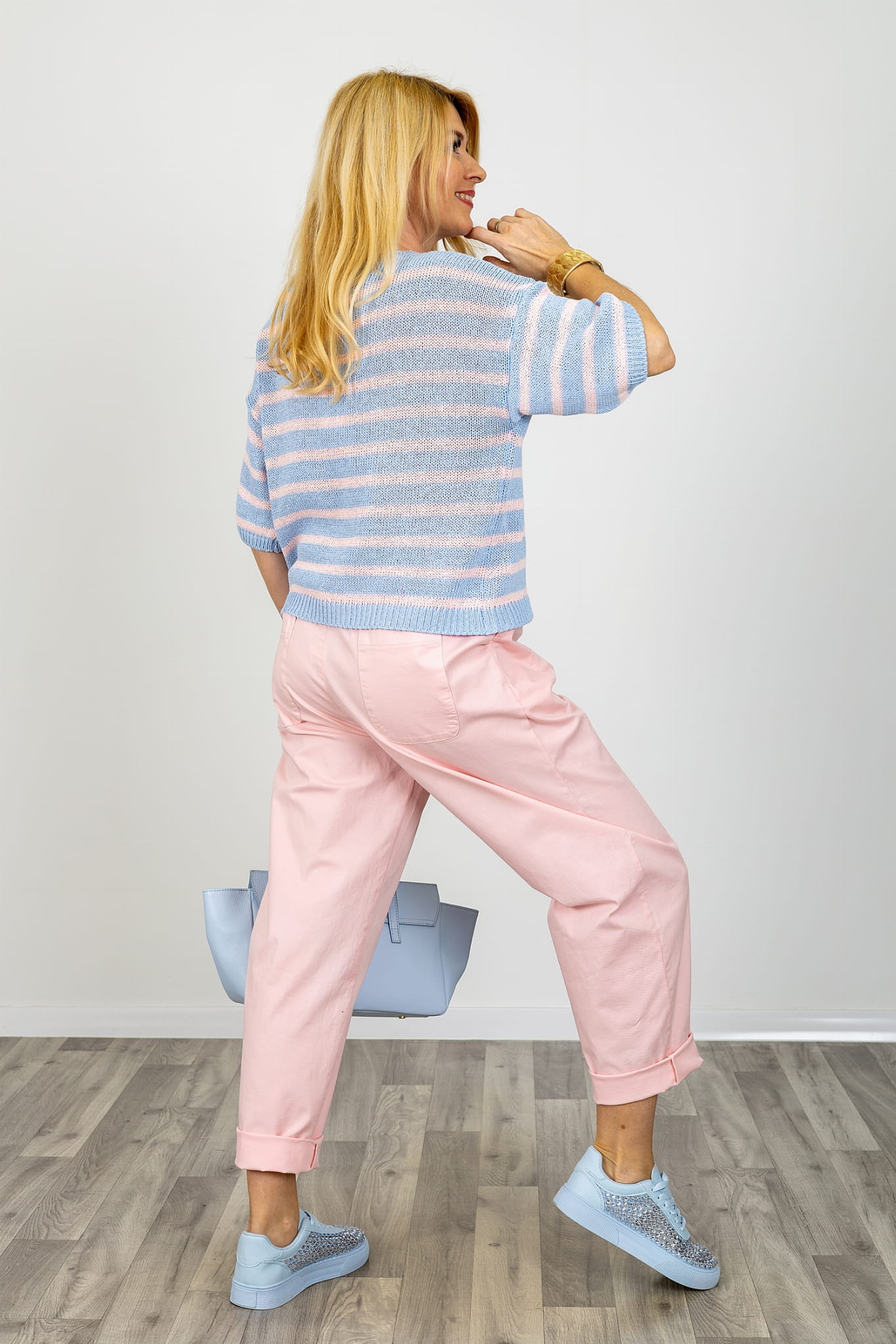 Dzianinowa bluzka oversize Monticchiello w paski to lekka i wygodna bluzka damska, która wyróżnia się swobodnym krojem oraz subtelną kolorystyką. Połączenie błękitnego koloru z delikatnymi paskami w odcieniu pudrowego różu tworzy harmonijną kompozycję, dzięki której bluzka dzianinowa damska w paski prezentuje się świeżo i bardzo stylowo.