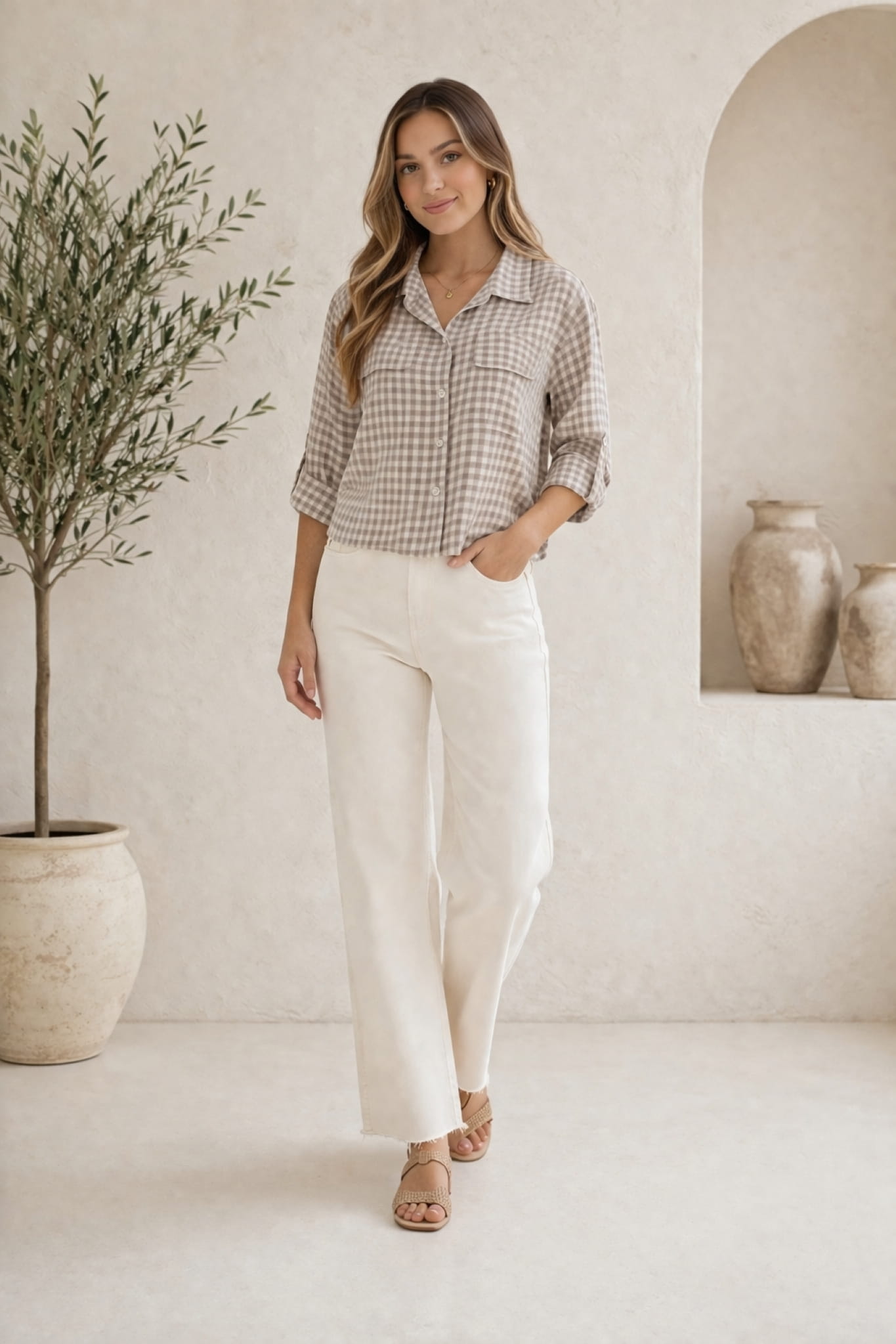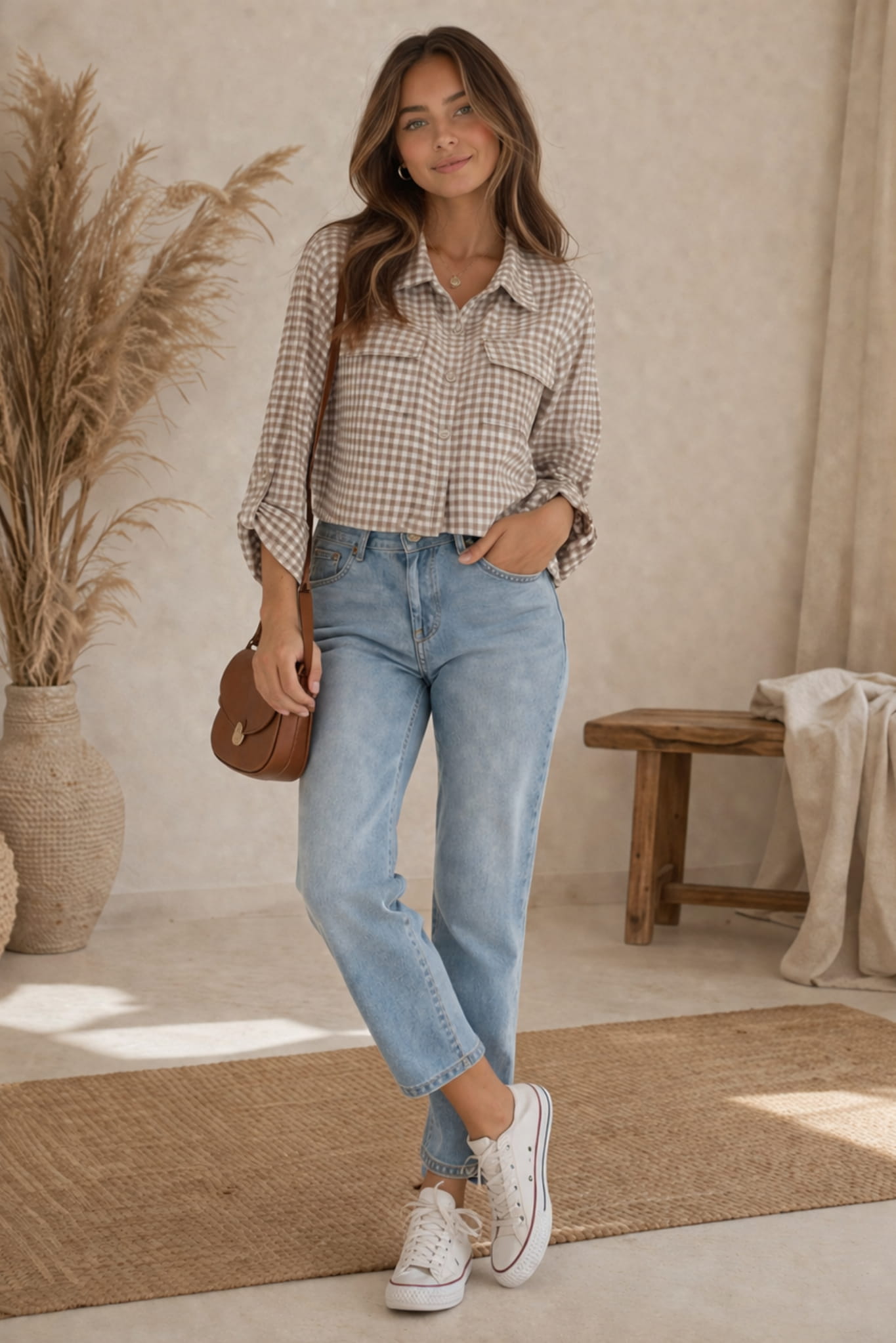 Koszula damska fango w kratę z kieszeniami i kołnierzykiem to połączenie praktyczności i stylu. Stonowana kolorystyka ułatwia tworzenie wielu zestawień, a drobna krata nadaje całości uporządkowany, dopracowany wygląd. To wybór dla kobiet, które szukają rzeczy uniwersalnych i ponadczasowych.