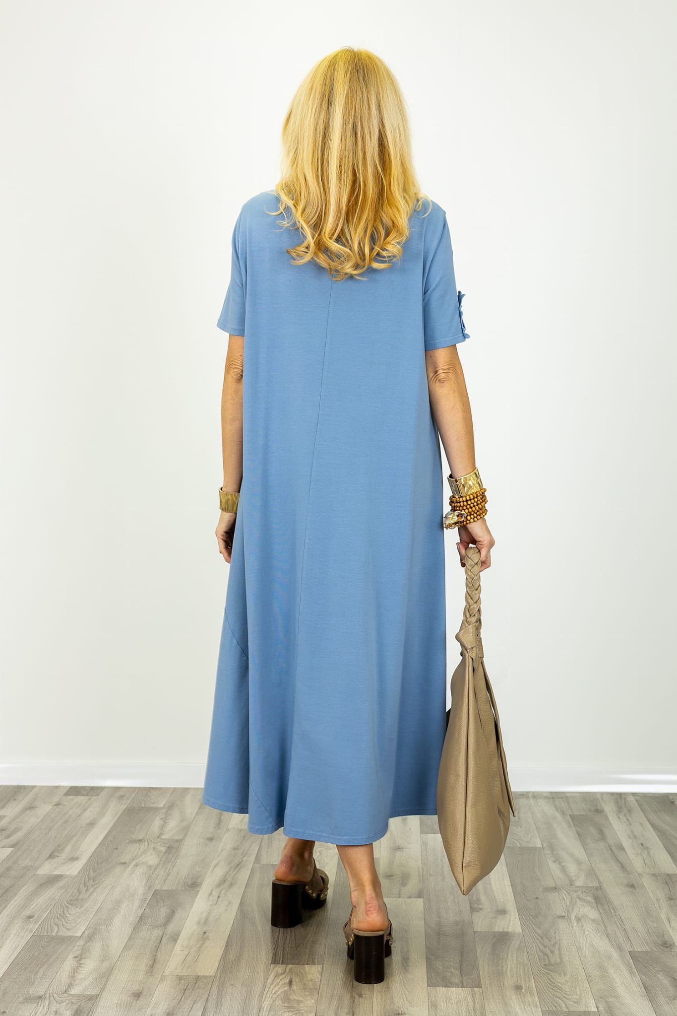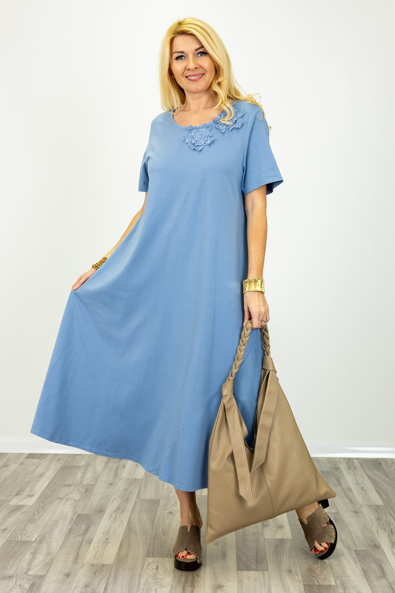 Sukienka maxi krótki rękaw okrągły dekolt kwiatki 3D przy dekolcie i na jednym rękawie Briosco błękitna