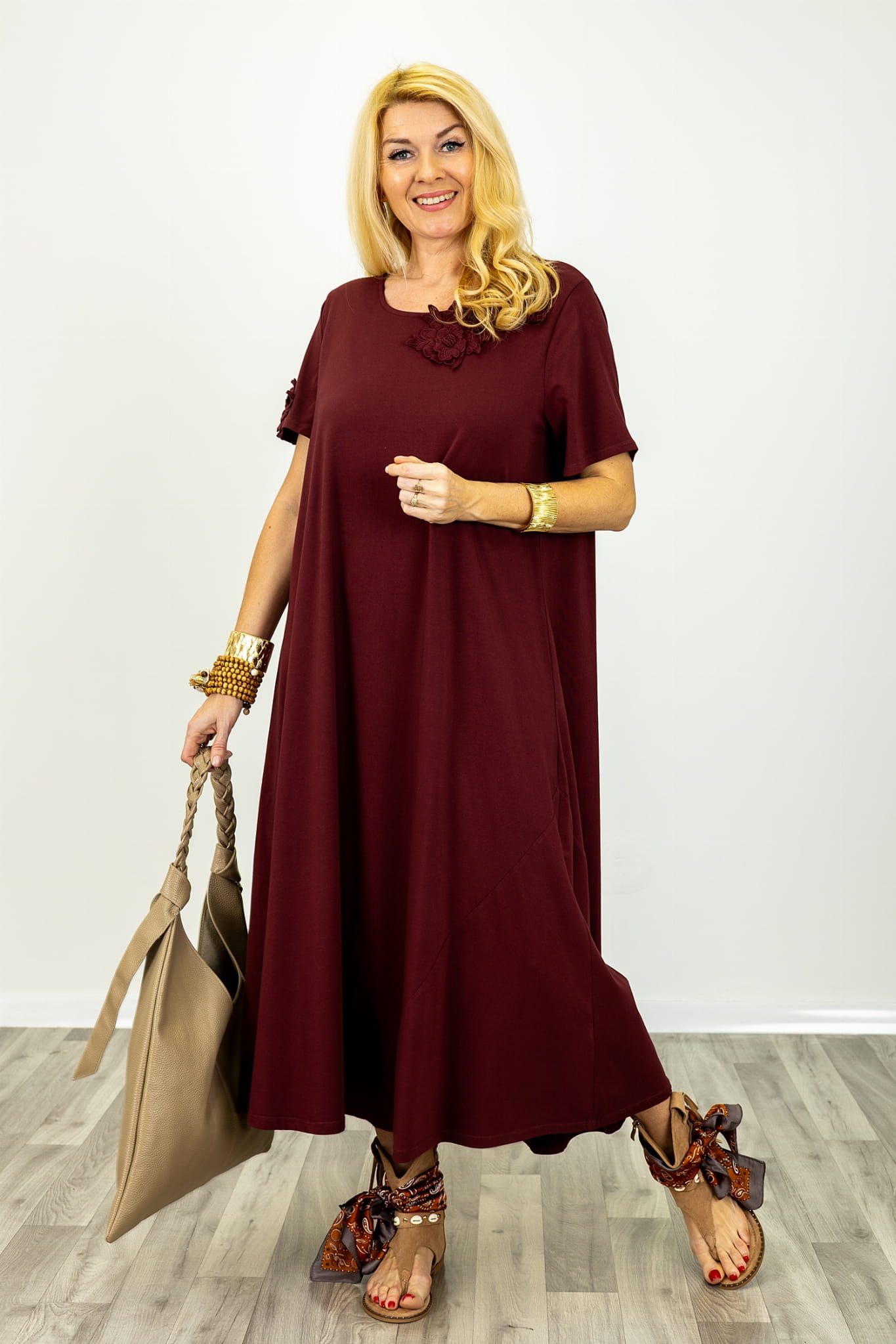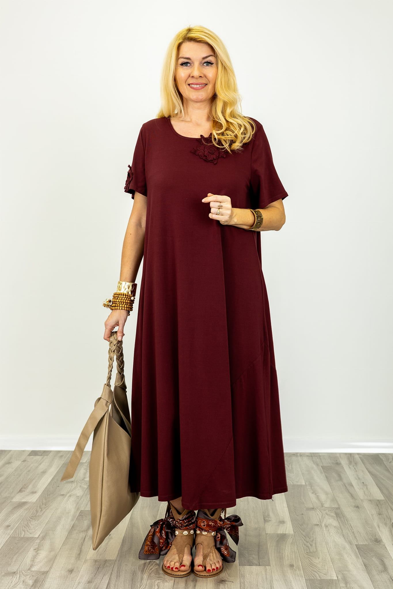 Sukienka maxi krótki rękaw okrągły dekolt kwiatki 3D przy dekolcie i na jednym rękawie Briosco bordowa